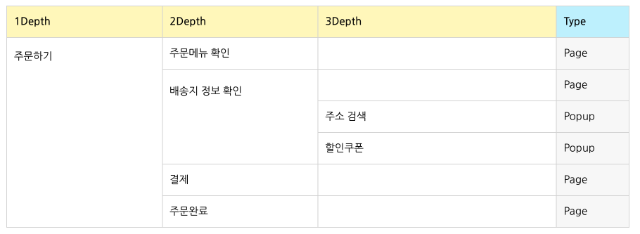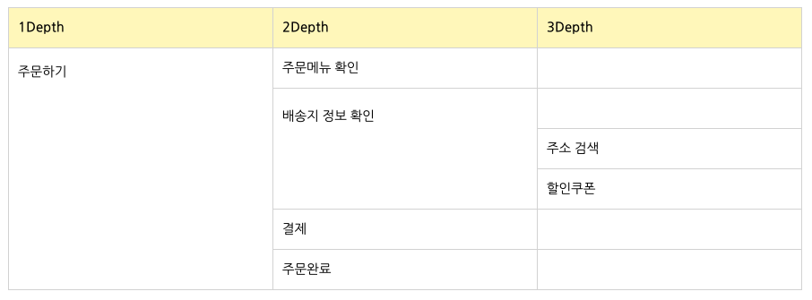 주문하기 기능을 구성하는 Step에 해당하는 구조는 위의 예시 표와 같이 2depth에 작성하게 됩니다.