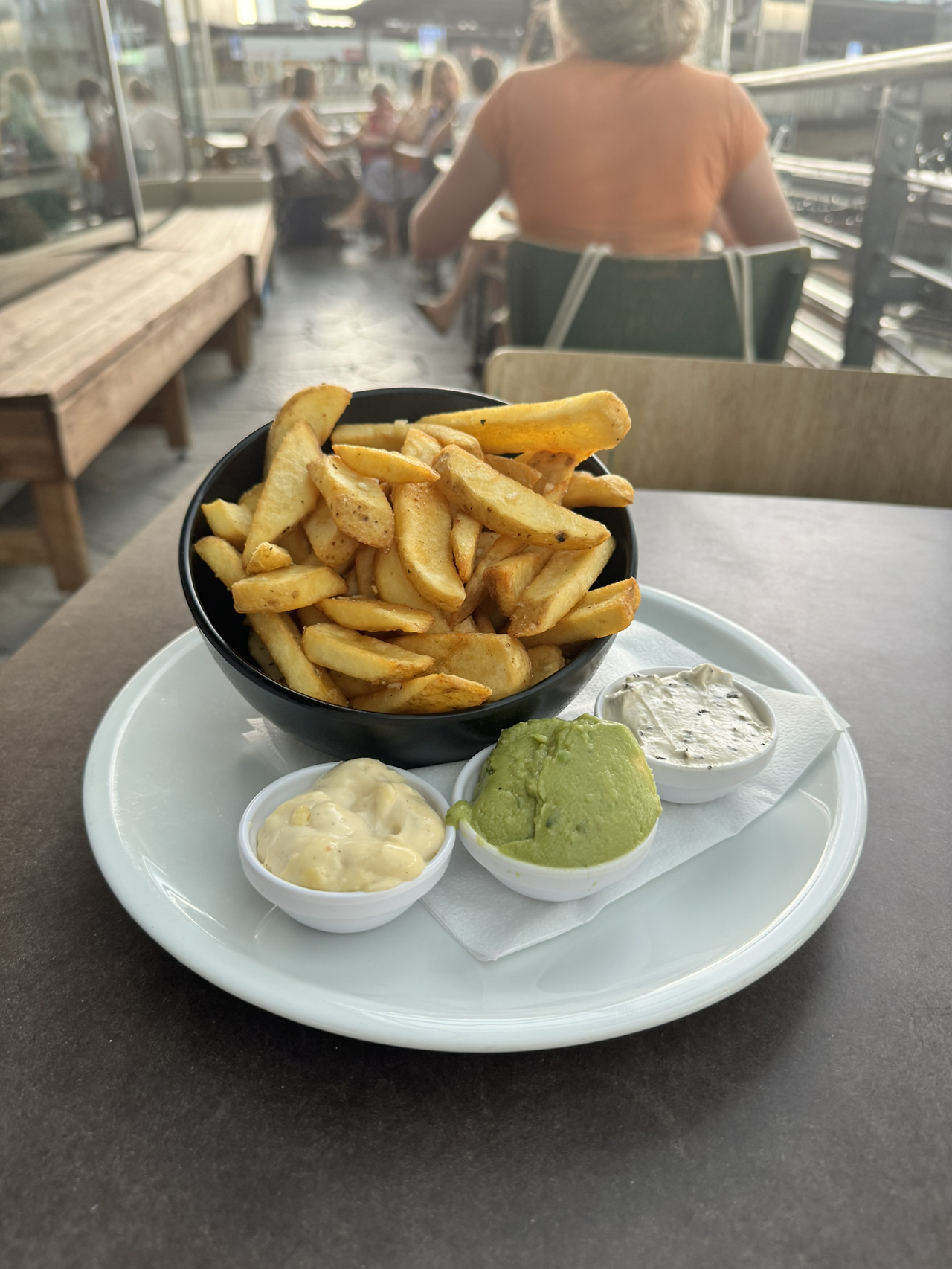 테라스에 앉아 감자튀김에 맥주 한 잔으로 간단히 저녁을 먹었다.
