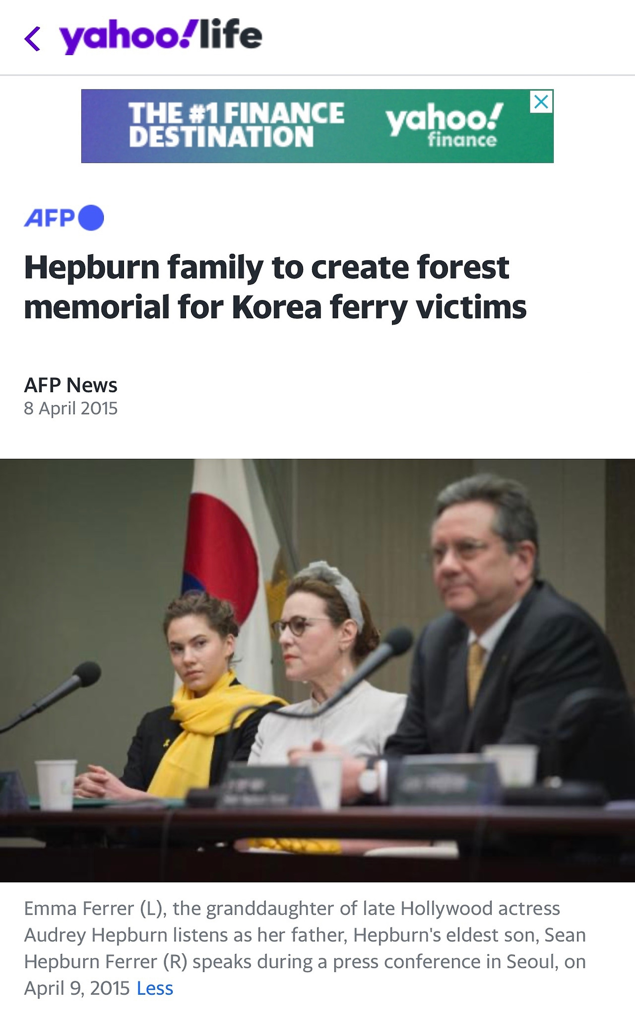 지난해의 세월호 여객선 참사 희생자 304명을 기억하기 위해 오드리 햅번의 장남이 한국에 추모 숲을 조성할 계획을 공개했습니다. 할리우드 아이콘 오드리 헵번의 장남이자 오드리 햅번 소사이어티 회장인 숀 햅번 페러가 이 프로젝트를 시작했으며, 서울 소재 비영리 단체인 트리 플래닛에 약 5만 달러를 기부했습니다.- 야후 뉴스