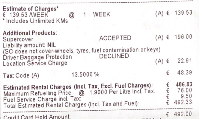 아래는 렌탈 영수증. 영수증에 찍혀있는 총 금액은 Estimated charge 즉, 예상금액이다. 예상금액이라 적힌 이유는 우선 차량 렌트+보험+연료 보증금의 합계라서, 나중에 우리가 반납할때 남은 연료만큼의 금액을 저 예상금액에서 차감 후 최종적으로 결제가 이뤄지는 방식이기 때문이다. 즉 반납할때 남은 연료의 양이 0이라면 저 금액을 다 내게 된다는 것이고 100%인 상태에서 반납하면 Fuel deposit 부분이 모두 반납된다는 말.