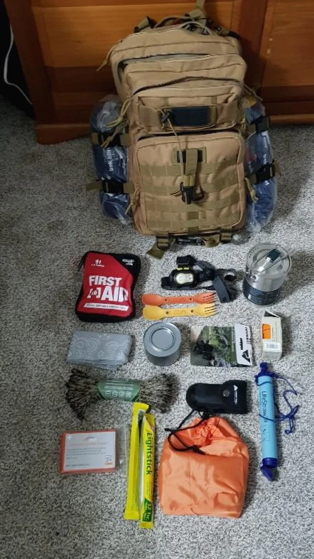 튼튼한 군용 가방 안에 든 물품을 나열하면 이렇다: 개별 침낭, 내의, 여분의 양말, 커다란 손수건, 아주 튼튼한 맥가이버 칼, 줄톱으로 활용 가능한 날카로운 와이어, 비상약품, 냉동건조식품, 2시간 반 동안 불을 피울 수 있는 메탄올 연료 한 캔, 방수 성냥, 휴대용 컵과 컵만 한 냄비, 포크와 스푼 겸용 캠핑 식기, 머리에 장착 가능한 손전등, 얇지만 보온성이 좋은 담요, 방수포, 로프, 방수 주머니, 물을 담을 수 있는 플라스틱 용기, 라이프 스트로와 여분 필터 여러 개.
