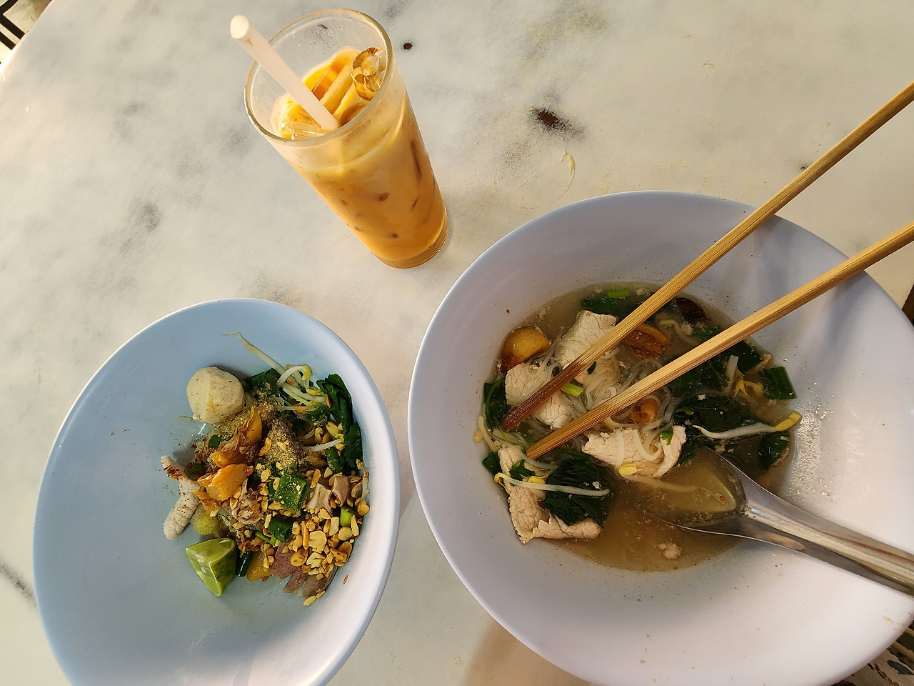 지난주에 허탕쳤던 국수집. 내 입맛에 문제가 있는 것 같다. 가이드북과 아케가 공통으로 추천한 맛집인데 난 별 세 개 정도밖에 줄 수가 없으니. 한 그릇 가지고는 택도 없는 양이 불만스러워 미각이 깨어나지 못했을지도 모른다. 한 끼 식사에 두 그릇을 시켜보긴 처음이다. 맑은 국수 하나, 비빔국수 하나. 타이 아이스티는 사카린을 넣은 듯 쓰디쓴 단맛. ‘먹어봤다’는 데 의미를 두고 나오는데 주인아저씨가 두 손을 모으고 고개를 천천히 숙이며 인사하신다. “컵쿤 캅~” 이 집 인기는 주인아저씨 덕분인지도 모르겠다. 나도 두 손 모으고 인사했다. “컵쿤 카~” 하지만..... 아마 다음엔 오지 않을 거예요.