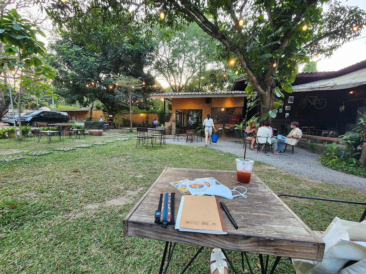 출국 전 어느 유튜버가 자전거를 타고 되는 대로 치앙마이를 돌아다니는 영상을 보았다. 그때 그 유튜버가 “어? 이런 데가 있었네?” 하고 들어갔던 곳이다. 치앙마이대학교 후문 쪽 랑머 지역 주택가에 있는 카페였다. 주문을 하는 단층 작은 건물은 보잘것없으나, 구불구불 키 튼 나무들이 휴식을 주는 넓은 잔디마당에 단박 무장해제되었다.