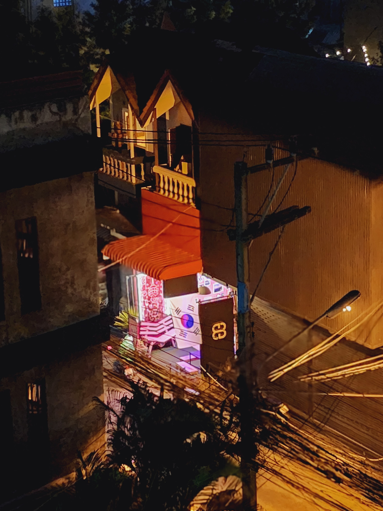 내 방 베란다에서 내려다보이는 한식집. 치앙마이에 한국식당은 꽤 많은데, 이 식당은 한국인이 아닌 태국인이 한다고 들었다. 내 키만 한 커다란 태극기가 매일 화려한 조명을 받으며 펄럭인다. 치앙마이에 태극기부대가 있을 줄이야.ㅎㅎ 태극기 맞은편엔 남산타워가 우뚝 서 있다. 식당 안엔 한국을 보여주는 것으로 추정되는 사진들이 벽을 장식하고 있다. 안을 자세히 들여다보지는 않았다. 귀국하기 전에 한 번 가서 먹어줘야지.