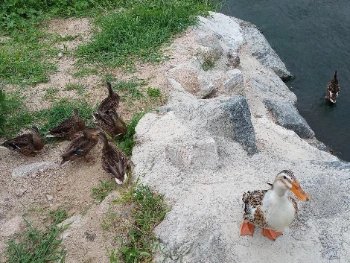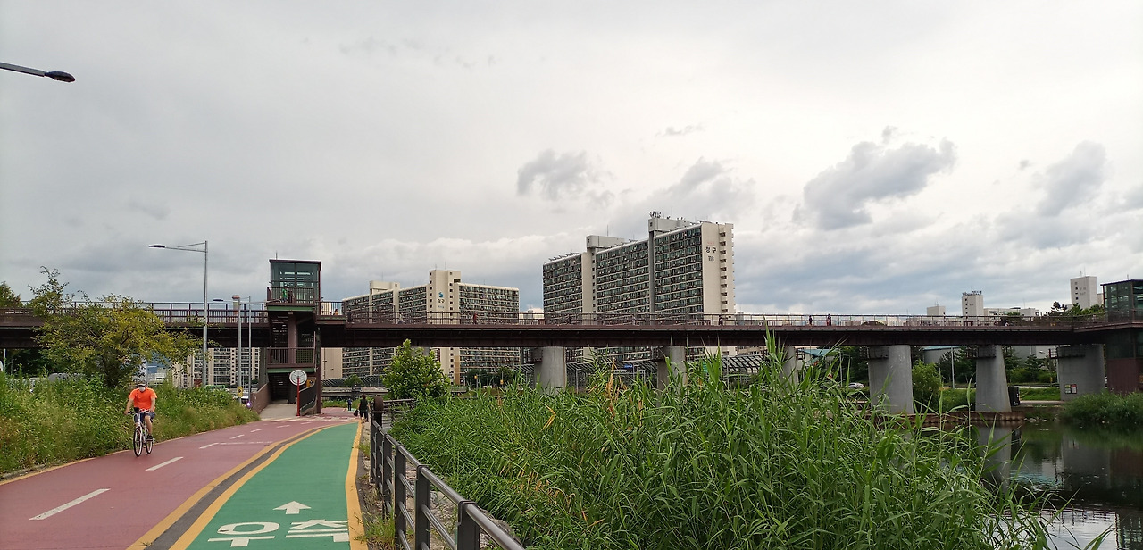 앗, 걸은 지 한 시간 반이 지났네. 돌아가야 할 시간. 5킬로미터 정도는 걸은 것 같다. 여전히 아파트 장벽, 잿빛 하늘, 거슬리는 자동차 소음. 풍경은 바뀔 낌새가 보이지 않는다. 돌아갈 때는 무성한 잡풀들 사이에 도드라지게 핀 꽃들, 강아지풀들, 드문드문 서 있는 나무들에 눈길을 주어야지. 뜻밖에도 샛강에 사는 청둥오리 가족을 만났다.