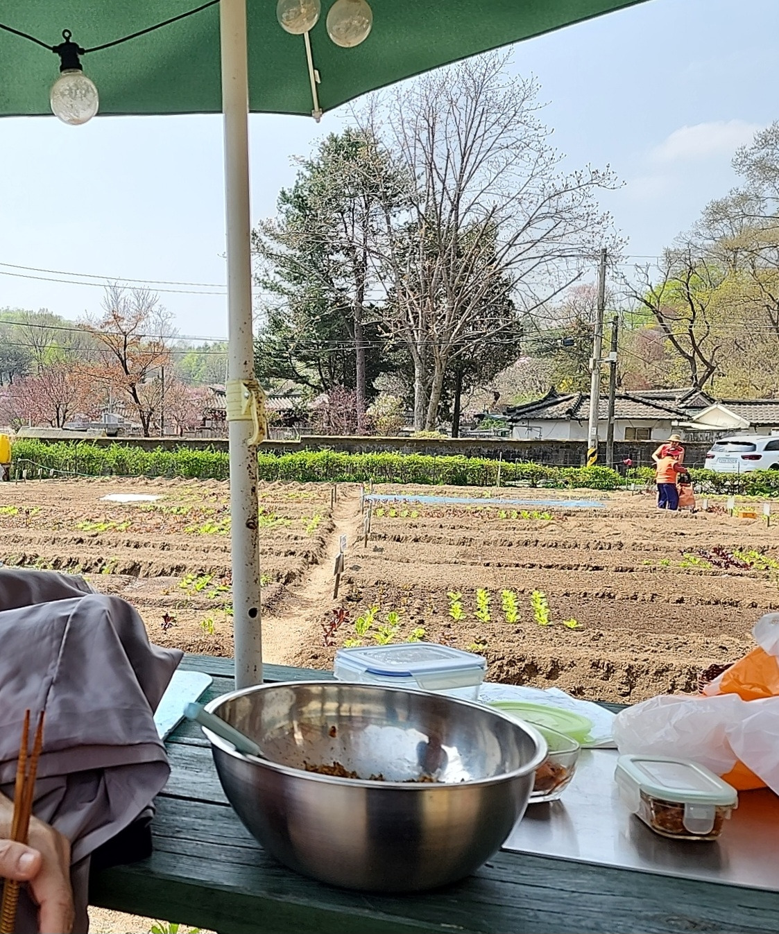 할머니가 텃밭으로 간 다음 나는 내 밭에 물을 주기 시작했다. 엄마는 테이블에 점심을 펼치고 텃밭에서의 식사 준비를 했다. 잡곡밥과 두부된장, 김치, 밑반찬 두 개. 상추가 아직 덜 자라 상추쌈은 다음으로 미뤘다. 작은 양푼에 밥을 넣고 두부된장으로 비벼놓은 다음 엄마는 농장 구경에 나섰다. 발걸음이 나보다 빨랐던 예전의 엄마 같으면 벌써 팔 걷어붙이고 나섰을 텐데, 이제 무릎 굽히고 쪼그려 앉는 것도 힘들어져 밭일은 엄두도 내지 못한다. 구경만으로도 즐거운 포지티브형 성격에 감사.