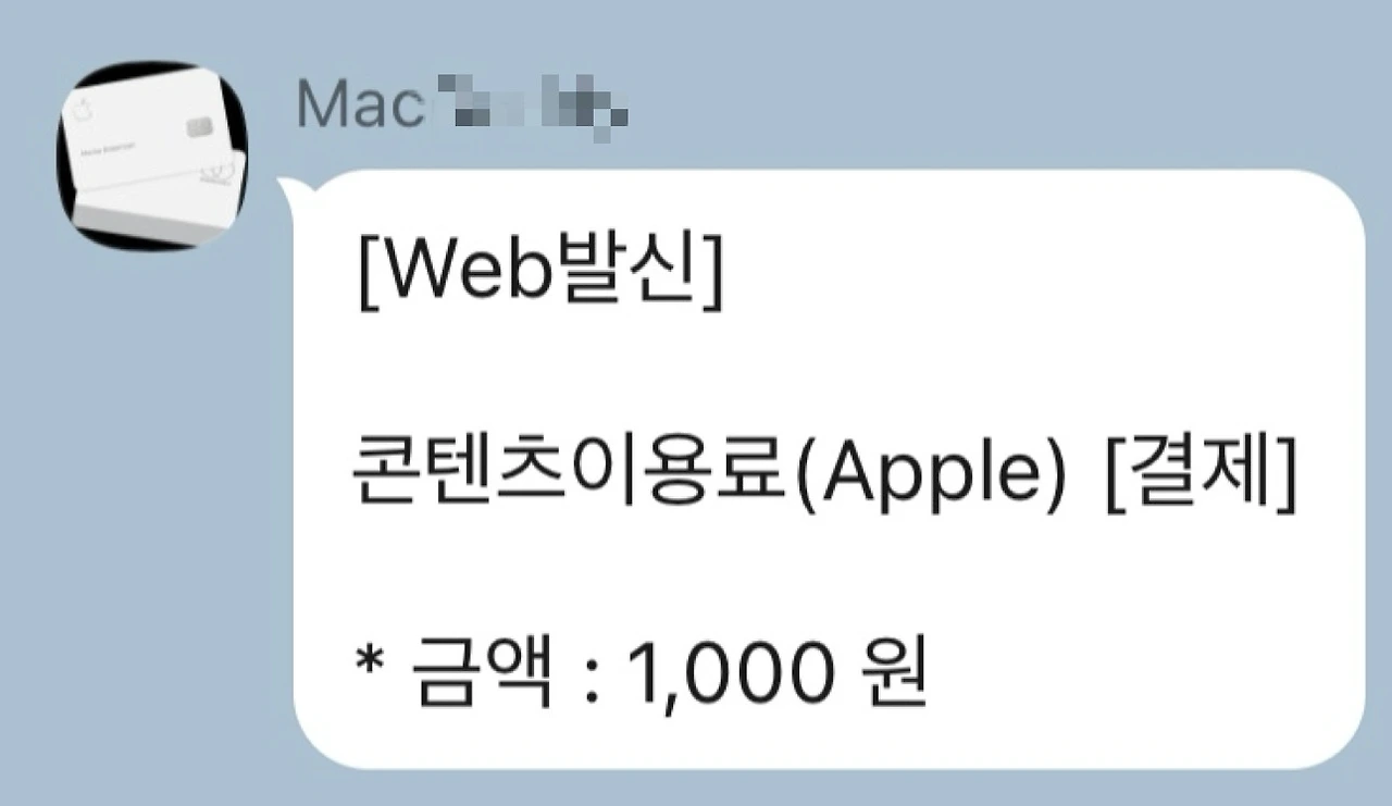 Q : 가족 중 Apple 기기 사용자가 아직 없으나, 방금 약혼자의 Apple 기기에서 제가 예전에 등록해준 신용카드로 5,000원이 결제된것을 확인 했습니다. 감사합니다.