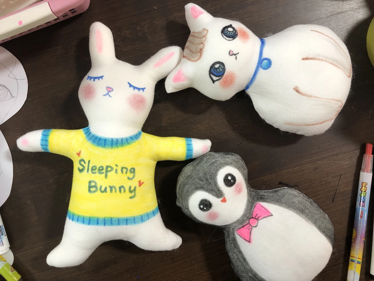 그때 내가 만들었던 인형은 ‘잠자는 토끼 인형’인데 미리 만들어 놓은 하얀색 무지 원단의 인형에 옷과 눈, 코. 입 등 그림을 그리고 색칠을 해서 완성하는 인형이었다.