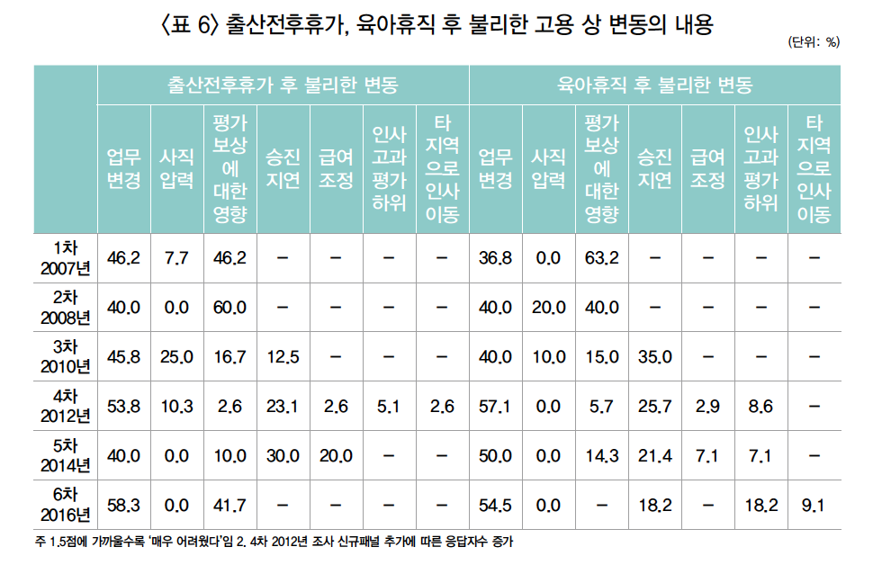 여성은 임신 기간 중 야근, 장거리 출장, 동료와 직장 상사로부터에게 소외됨으로서 어려움을 겪지만 직장 복귀 후에는 더 지난한 시간을 보낸다. 한국여성정책연구원의 2017년 연구 결과에 따르면, 육아휴직 제도가 있음에도 이를 사용하는 여성들은 60%이고, 그 중 11~21%의 여성은 직장 복귀 시 고용 상 불리한 경험을 겪었다. 가장 큰 변동으로는 '업무 변경'이었다. 출산전후 휴가 사용과 육아휴직 사용자들에 대한 고용 상 불리한 변동은 근로기준법에서 엄격하게 금지하고 있다.
