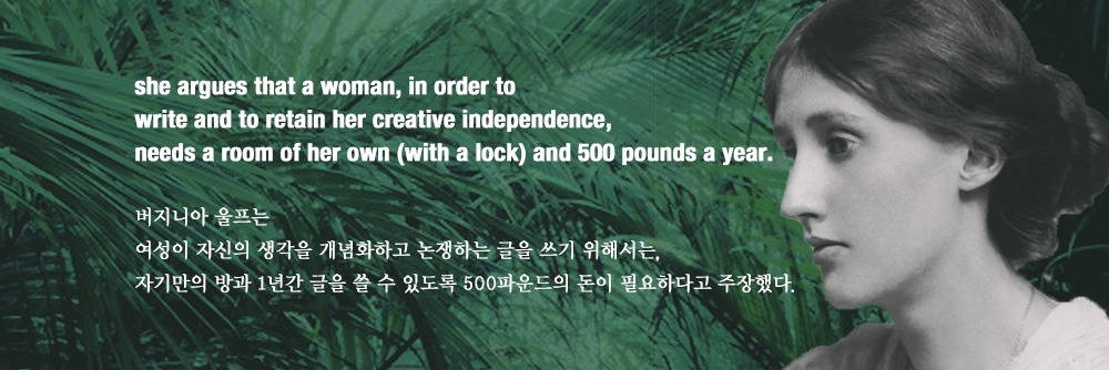 “여성이 자신의 생각을 개념화하고 논쟁하는 글을 쓰기 위해서는, 자기만의 방과 1년간 글을 쓸 수 있도록 500파운드의 돈이 필요하다고 주장했다.” - 버지니아 울프, <자기만의 방>