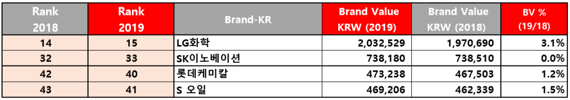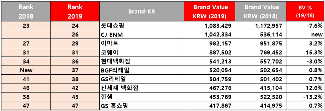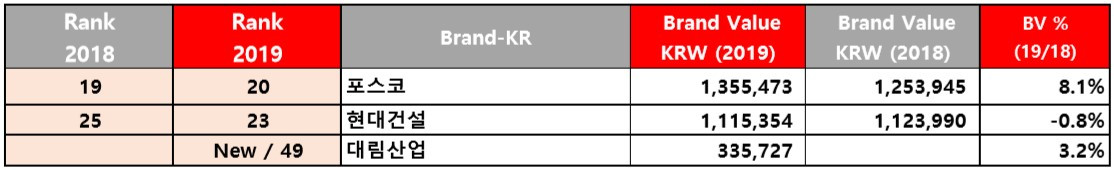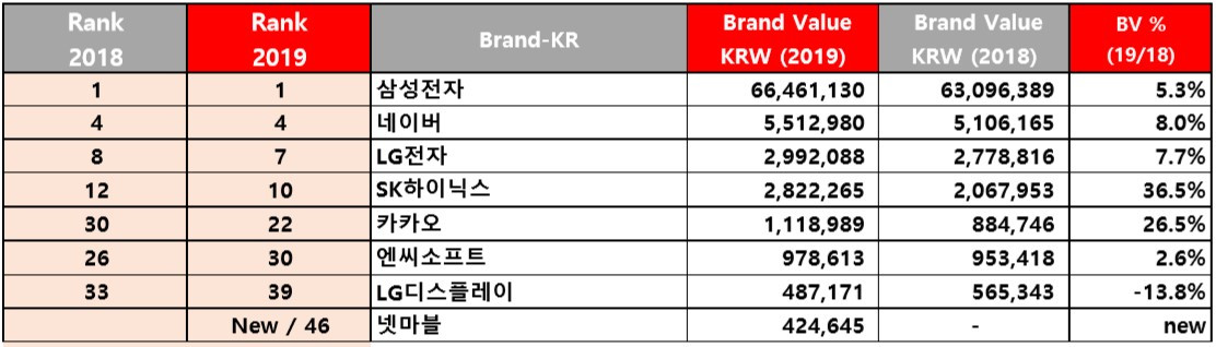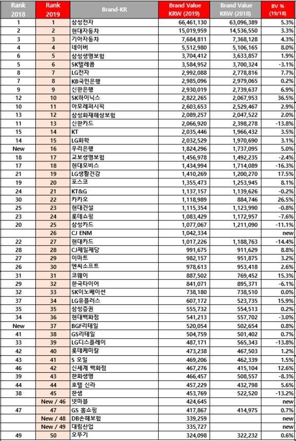 이외에도 CJ ENM, 넷마블, DB손해보험, 대림산업이 2019년 베스트 코리아 브랜드에 새롭게 진입했다. CJ E&M과 CJ오쇼핑의 합병 법인인 CJ ENM(26위)은 브랜드 가치 1조 423억원을 기록하며 단숨에 26위에 이름을 올렸다. 넷마블(46위), DB손해보험(48위), 대림산업(49위)은 각각 4,246억원, 3,392억원, 3,357억원의 브랜드 가치를 보유하고 있다.