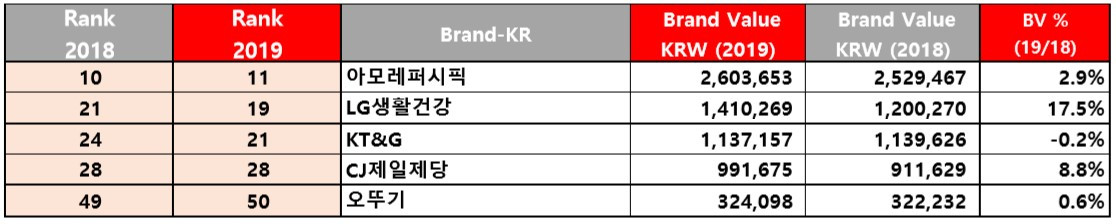 2019년 베스트 코리아 브랜드 소비재(FMCG) 분야 브랜드들 중 단연 돋보인 것은 LG생활건강과 CJ제일제당이었다. 2018년 LG생활건강은 매출과 영업이익 모두 전년 대비 각각 10.5%, 11.7% 상승하며 14년 연속 사상 최고 실적을 경신했다.