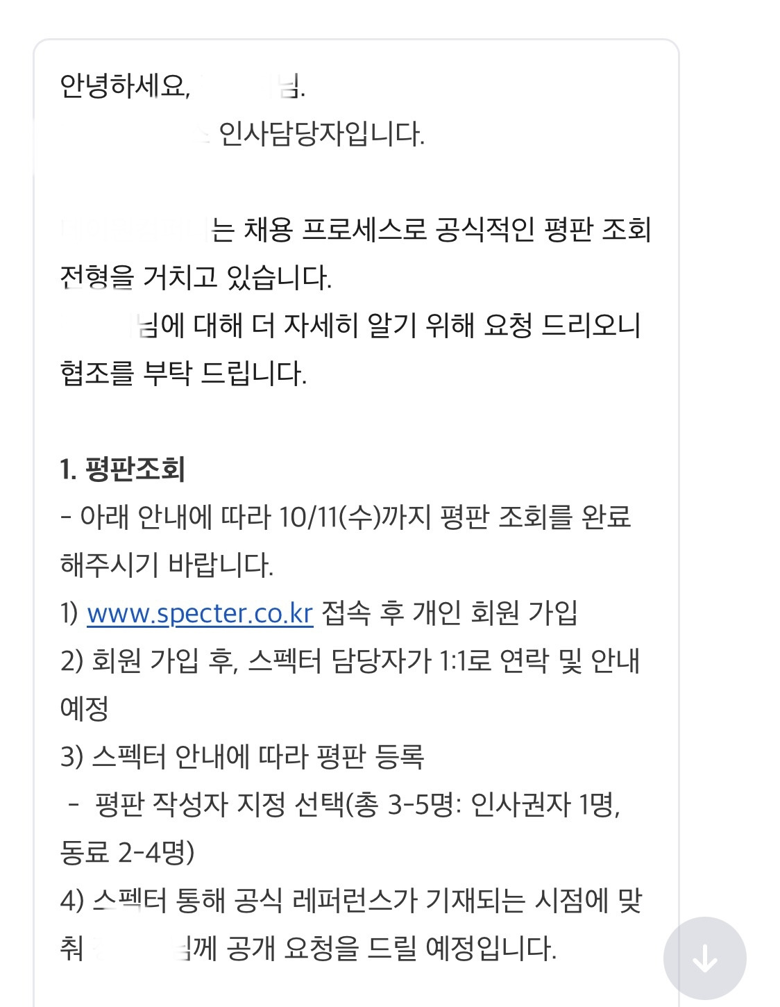 메시지를 눌러보기 전에 어찌나 긴장이 되던지 나도모르게 심호흡을 하게됐다. 마음을 가다듬고 메시지를 눌러보니 내용은 바로 평판조회 요청.