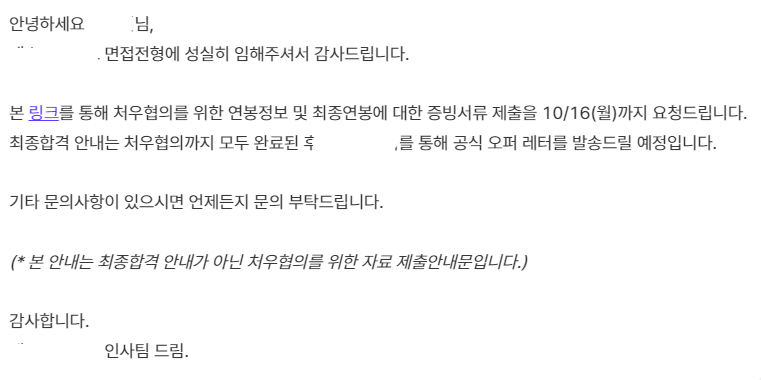 다만, 마음에 걸리는 부분은 인사 담당자분께 제시한 연봉이 회사 내규와 맞지 않을 경우 조율을 하는 것인지 아니면 최종 입사가 불발되는지 여쭤보니 두 사안이 모두 적용된다는 피드백을 주셨다는 것. 그래서, 사실 희망 연봉을 제시했지만 마음은 다소 무거운 상태이다. 1차,2차, 평판 조회까지 얼마나 많은 시일이 걸렸는지. 한 달 이상이 소요되는 이 면접 기간동안 1시간 동안 현장 과제를 봤던거 하며, 평판 조회 작업으로 3년 만에 전 직장 팀 리드분께 연락드린 것등 꽤나 많은 시간과 에너지를 소모했기에 더 복잡한 심정이다.