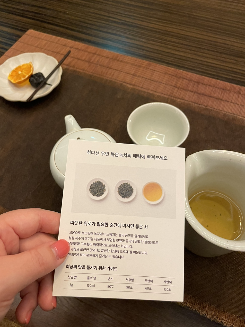 요가원에서 맡았던 은은한 향 냄새부터, 다양한 다도 용품까지. 이것저것 물건들을 구경하던 중, 오늘 티 클래스를 진행해주시는 선생님의 안내와 함께 한방으로 들어갔다. 4가지의 차 선택지 중에 고를 수 있는데 나는 우빈이라는 볶은 녹차를 골랐다. 차의 이름치고는 낯설게 느껴지는 우빈은 '따뜻한 위로가필요한 순간에 마시면 좋은 차'라고 한다. 선생님께서는 왜 이 차를 골랐는지 물어봐 주셨고, 잠깐의 대화 후에 차를 우리는 방법을 알려주셨다.