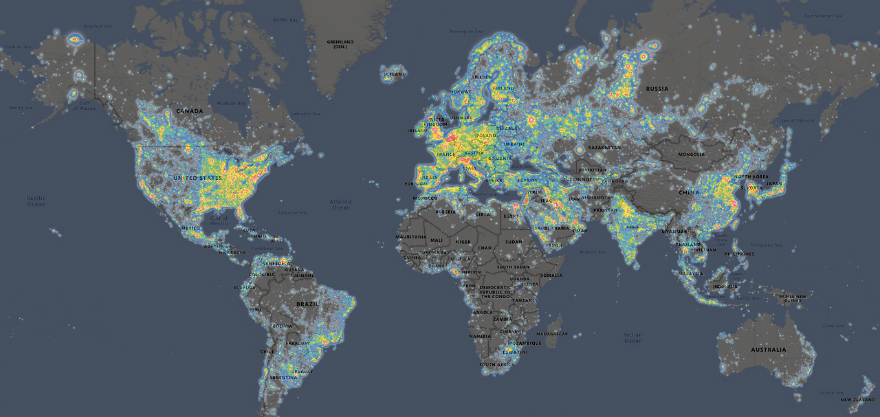 광공해 지도. 미 동부와 유럽, 동북아시아가 눈에 띄게 밝은 모습이다. /빛공해과학기술연구소(ISTIL)