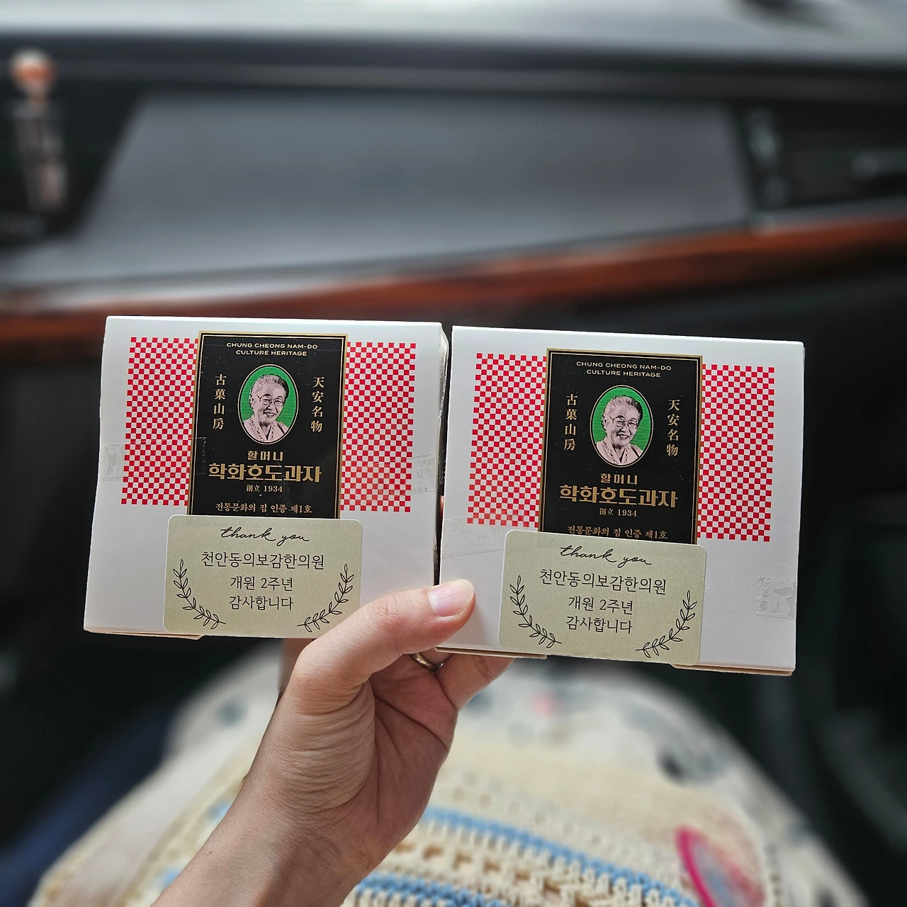 처음에는 며칠간 떡을 돌리고 싶었는데, 무더운 날씨 때문에 상하진 않을까 염려가 컸다. 고심 끝에 정한 답례품은 바로 호두과자! 천안 하면 또 호두과자 아니겠는가. 사실 천안 사람들은 주로 선물이나 하지 일부러 찾아 먹을 일은 없어서 의외로 호두과자가 귀하다. 마침 호두과자 9알씩 작은 상자에 포장하고 원하는 문구를 넣어 스티커까지 붙여준다고 하여 9월 첫 3일 정도는 호두과자 선물을 함께 드렸다. 아니나 다를까 환자분들께서 참 좋아하셨다. 떡은 보관이 어려워 가장 고민했던 부분이었는데, 성공리에 마무리되어 참 뿌듯했다.