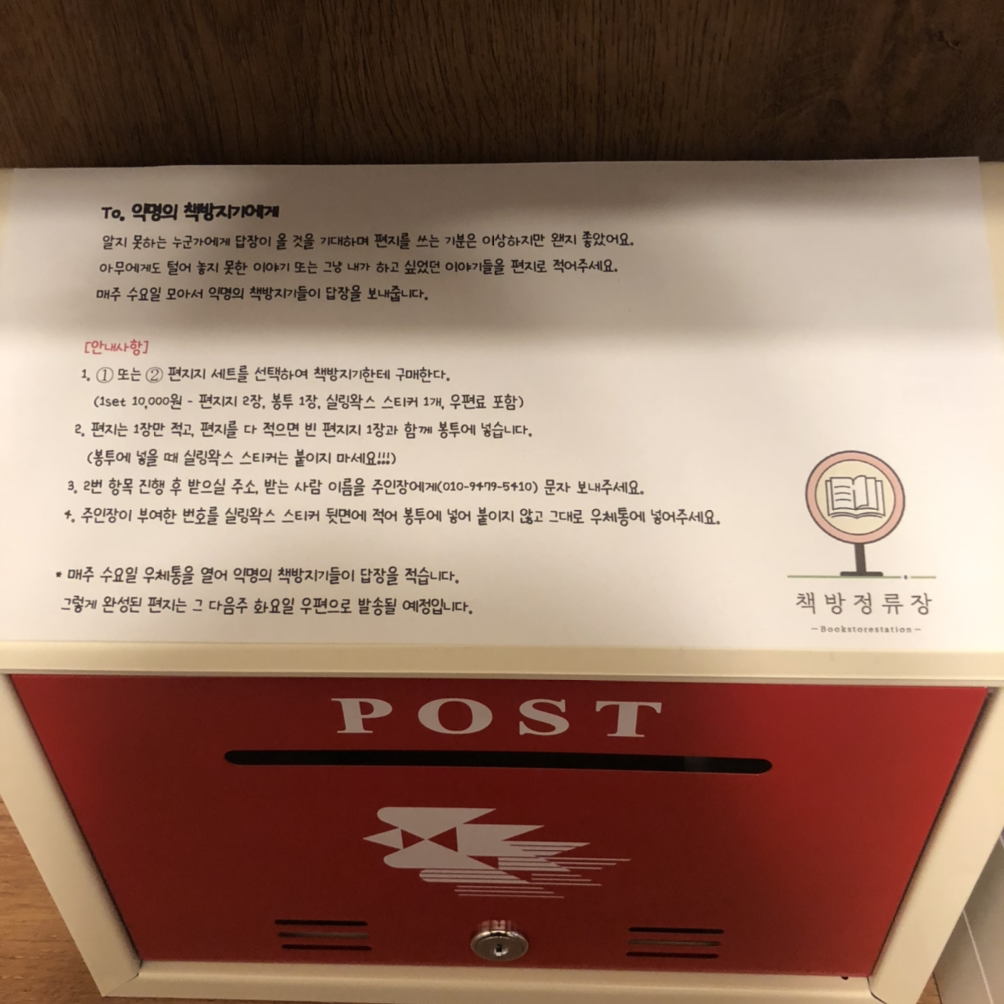 책방정류장에는 따뜻한 우체통이 있다. 익명의 책방지기에게 고민이나 어디 가서 털어놓지 못했던 이야기들을 편지로 쓰면 답장을 해주는 편지함이다. 책방지기가 된 후 처음으로 편지가 들어왔다. 무려 두 통이나! 한 통은 내가, 다른 한 통은 화요일의 책방지기님께서 답신을 쓰기로 했다.