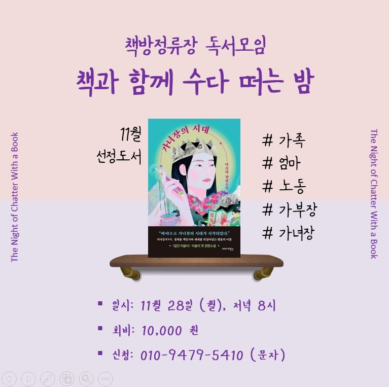 벌써 능숙해진 6번째 출근 날에는 다음 주 열리는 독서모임 참가자들에게 보낼 '사전 공지 문자' 내용을 생각해 보자는 연락을 받았다. 참! 총 2회의 독서모임을 계획했다. 좀 더 자주 사람들을 모아보고 싶었지만 역량 부족으로 한 달에 한 번 씩, 한 권의 책을 선정하여 독서모임을 개최해보기로 했다. 일단 11월 모임을 위해 선정한 도서는 이슬아 작가의 첫 장편소설 <가녀장의 시대>이다. 이미 메일링 서비스를 통해 한 편씩 읽어본 글이고, 작가님에 대한 팬심, 그리고 평소 관심이 많은 주제인 '가족'이나 '노동'에 관한 이야기를 나눠볼 수 있을 것 같아 이 책을 첫 모임 도서로 골랐다.