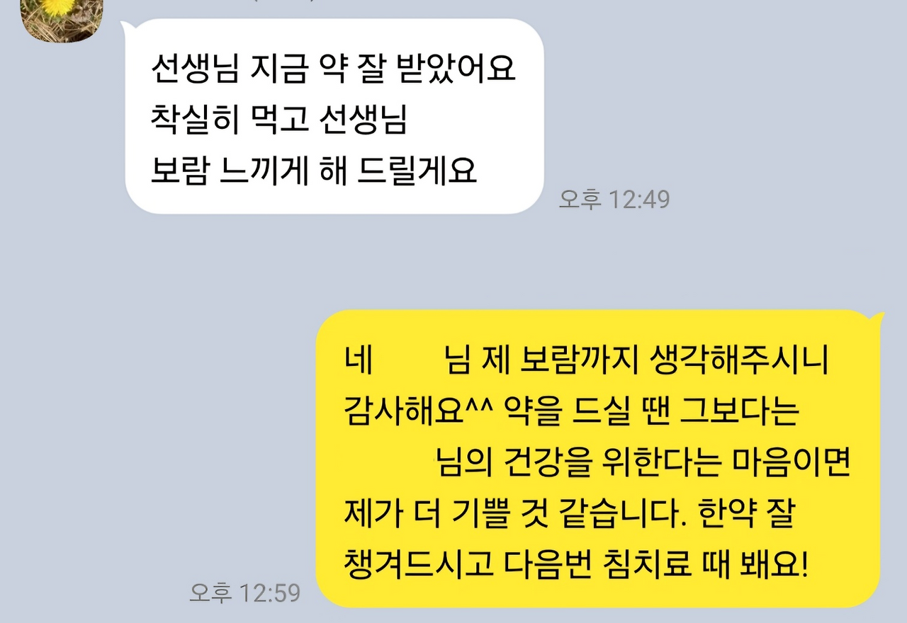 약을 보내드린 다음날 이런 메시지가 와 있었다. 그렇게 비싼 돈을 어렵게 지불하시고도 나의 보람을 위해 착실히 약을 챙겨 먹겠다는 환자라니. 그런 마음을 낼 수 있는 사람이 과연 몇이나 될까.