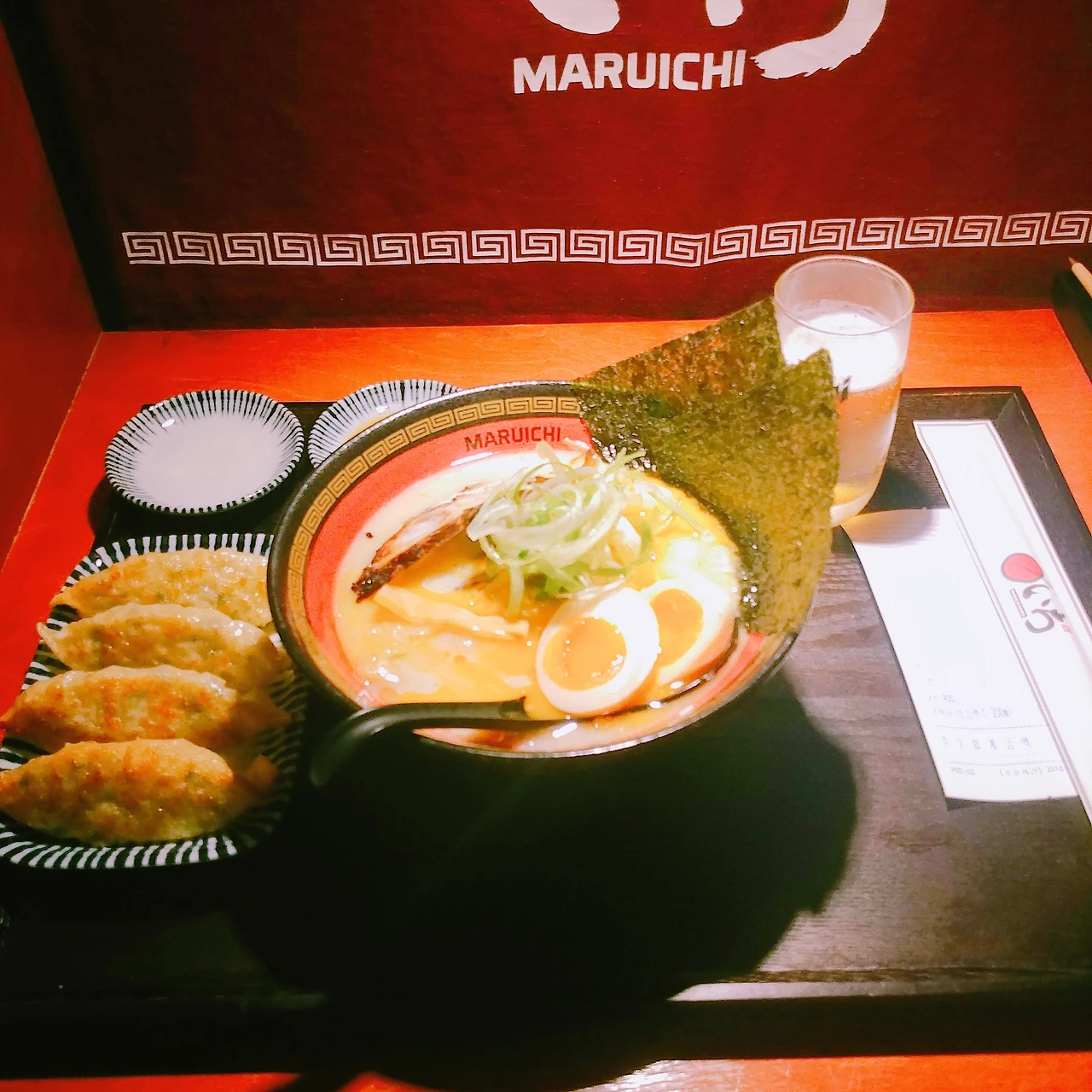 J : 음, 혼밥은 아무래도 일본. 일본 하면 또 라멘이 떠오르다 보니까, 자연스럽게 오늘은 라멘이다, 하고 생각했던 것 같아요. 그리고 사진처럼 칸막이가 있는 곳은 혼밥 하기가 좋기도 하고. 라멘에 토핑을 추가하고 사이드 메뉴도 시키고 해서, 이걸 다 먹을 수 있으려나 생각했었는데 또, 다 먹더라고요. (웃음)