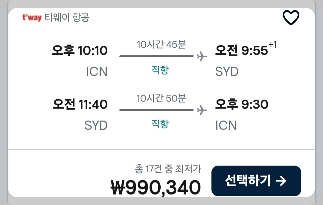 2025.5월 기준 인천→시드니 직항 99만 원.