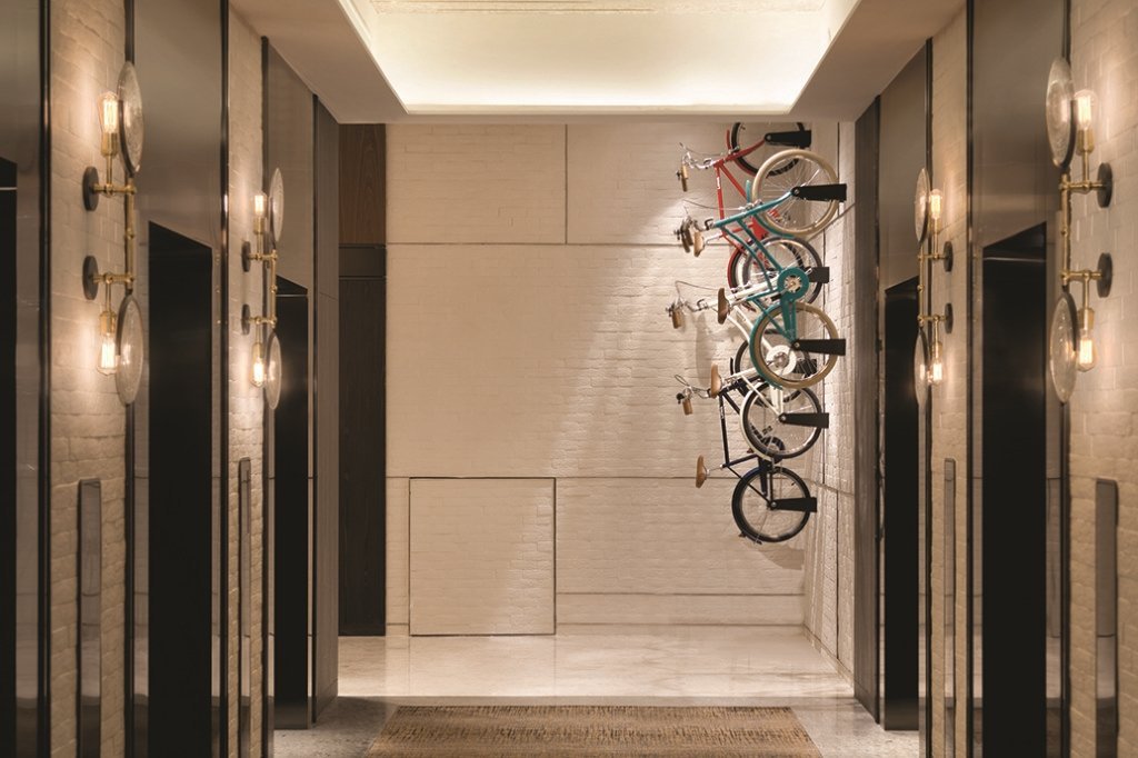 그리고 또 호텔 안에서 인테리어로 자주 사용되는 아이템으로 자전거를 사용하였는데요, 특히 로비의 카페는 자전거가 테이블 다리가 되어 트랙을 달리는 것처럼 표현하여 시각적인 즐거움을 선사하고, 로비 엘리베이터 옆에는 자전거를 벽에 매달아 두어 고객들이 유니크한 사진을 찍어서 SNS에 포스팅할 수 있도록 하였습니다.
