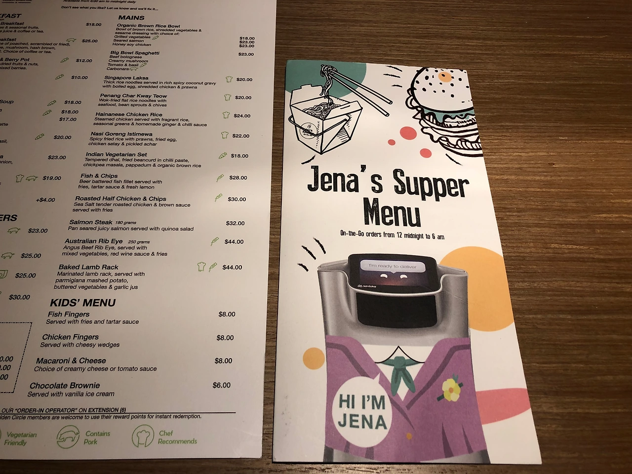 특히 이곳에서는 제나를 활용해 객실로 음식을 딜리버리를 하는 Jena’s Supper Menu를 룸서비스 메뉴와 별개로 운영하고 있기도 합니다.