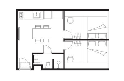 투 베드 룸을 한번 살펴볼까요? 평면도를 보면 알 수 있듯이, 같은 투 베드 룸이지만 욕실을 하나로 하여 공용공간을 넓힌 타입과 개개인의 욕실을 객실 안에 두고 작은 주방은 남겨 편리성을 져버리지 않은 타입 등 다양한 취향을 고려해 객실을 만들었다는 것을 알 수 있습니다.