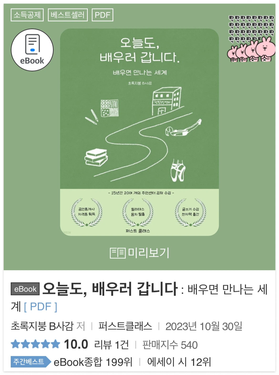 늦여름에 시작하여 가을 문턱에 이르기까지 이어진 전자책 출간 수업은 조촐하게 출판을 기념하며 끝났다. 인터넷 출판사 한 곳에서 이미 책을 찾아볼 수 있었는데 직접 만들어 아마추어 냄새가 풀풀 나는 표지를 발견하는 일은 부끄럽고도 짜릿한 경험이었다. 전자책 출간이라, 실감 나지 않는 현실 속에서도 책 출간 소식을 알리고 싶어졌다. 가족들, 친구들, 글쓰기 수업 선생님.... 사실 이 책을 누가 읽어줄지 싶은 생각에 주저하는 마음이 없지 않았다. 딱 커피 한 잔 값으로 책값을 정하면서도 이것도 너무 부담될 정도로 가치 없는 글을, 디지털 쓰레기를 더한 것은 아닌지 생각이 많아지기도 했다. 하지만 인터넷서점에서 책을 발견하는 순간 바로 공유 버튼을 눌러 모든 단톡방에 간단한 메시지와 함께 공유했다.