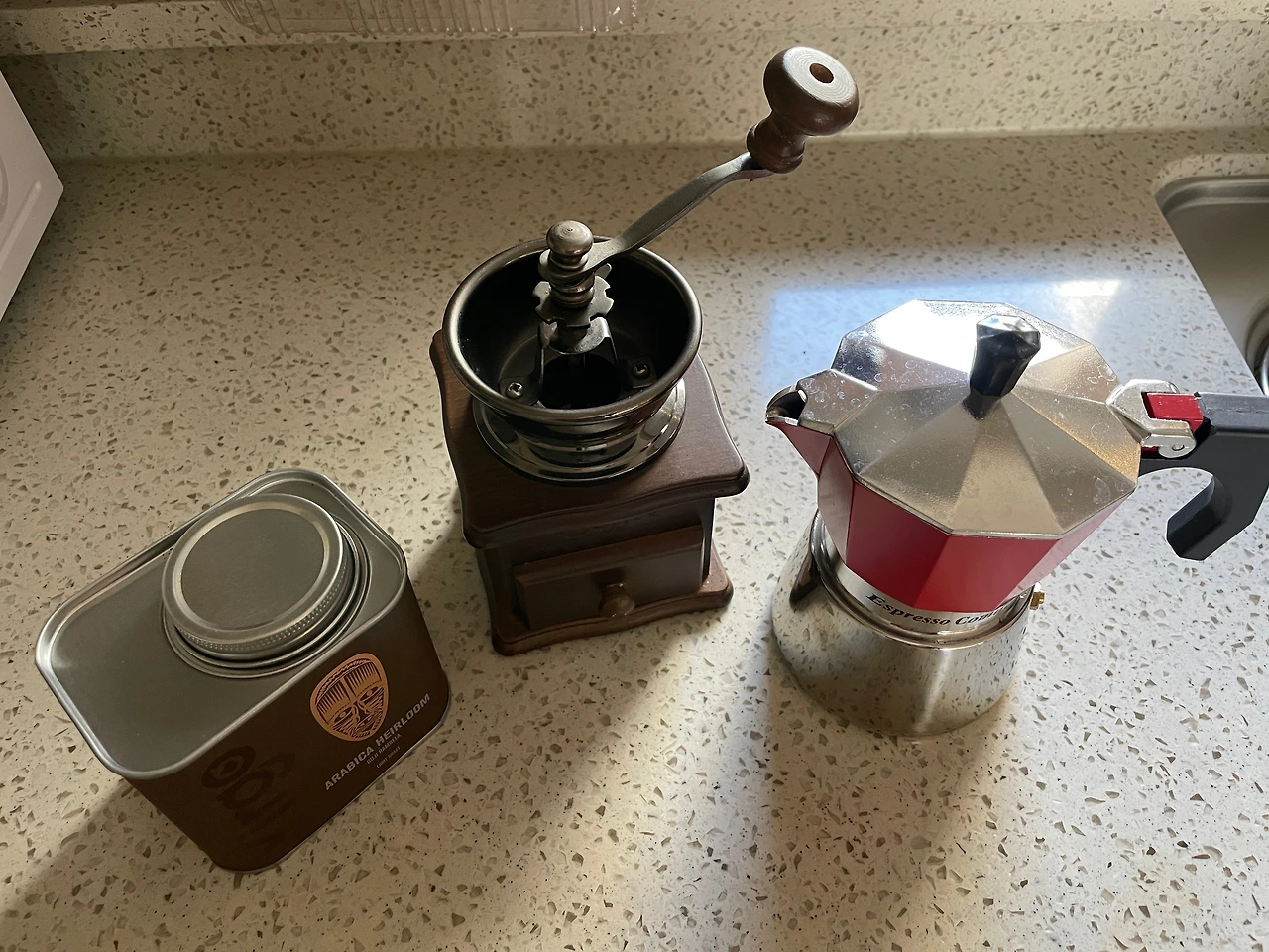 쌓인 먼지를 닦아낸 후 원두를 집어넣고 손잡이를 돌리기 시작했다. 연필이 깎이는 소리같이 서걱거리는 소리가 순조롭게 나기 시작했다. 하단에 달린 서랍에 어느 정도 쌓인 분말을 모카포트에 채우고 또다시 갈기 시작하는데 드르륵드르륵 힘겹게 돌아가다가 잠시 멈춤, 힘을 다해 다시 돌리다 보니 땀이 난다. 한겨울인데, 실내에서도 양말에 조끼까지 입어야 할 정도로 추운 날인데 원두 갈다가 땀이 나다니...... 그러니깐 역시 드라마는 드라마일 뿐이었던 걸까, 아니면 그저 성미에 안 맞는 걸까?!