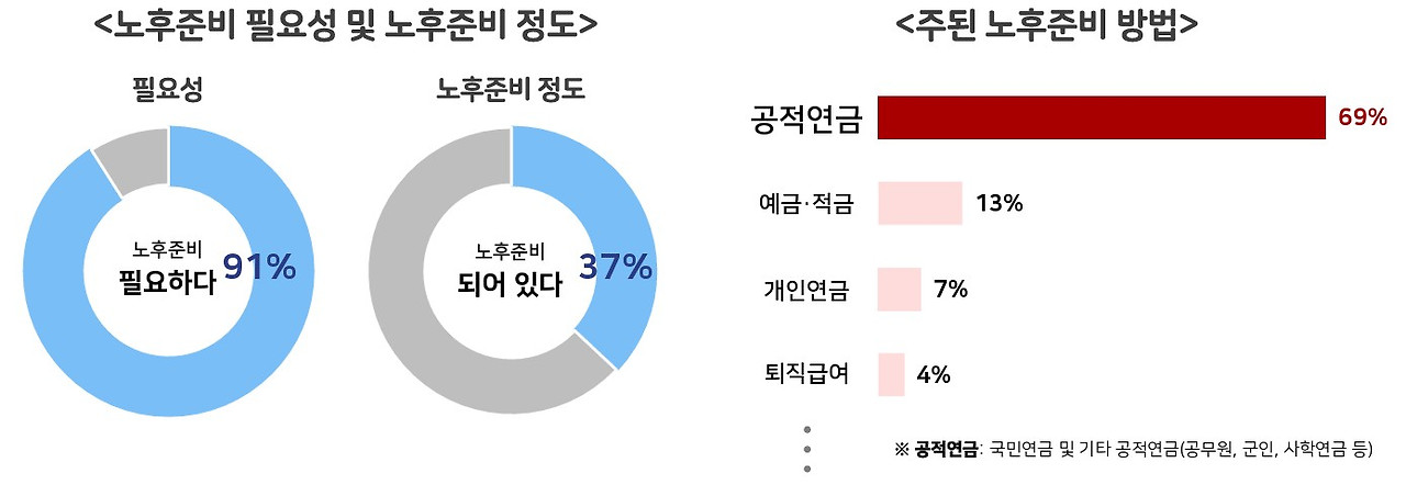 국민연금연구원의 ⌜제10차(2023년도) 중·고령자의 경제생활 및 노후준비 실태⌟ 조사 보고서에 따르면 노후시기 해당자 중에서 ‘타인의 도움 없이 독립적인 경제력을 갖췄다’고 응답한 비율은 54.7%에 불과한 것으로 나타났다. 또한, 스스로 노후 준비를 하고 있다는 응답은 44.4%에 그쳤다.