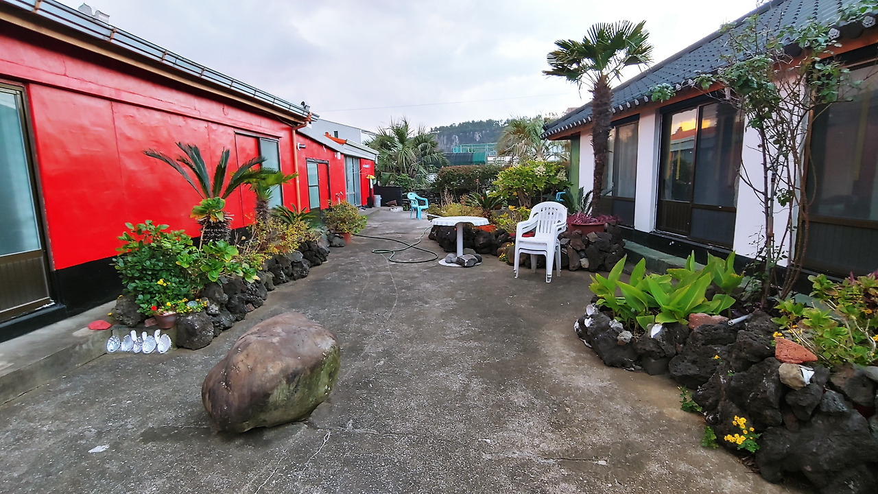 얼굴이 금세 환해지시더니 그럴 테냐고 안 멀다고 가자고 하신다. 조금만 더 걸어서 모퉁이를 돌자마자 민박집 간판 자리가 그대로 있는 깔끔한 집이 나온다. 예전에 유명했다는 동굴 민박집이다. 두 채의 건물이 있고 왼 편의 붉은색 건물은 새를 주었고 할아버지는 오른쪽 집에 사신다. 다음은 할아버지께서 설명해 주신 동굴 민박의 유래.