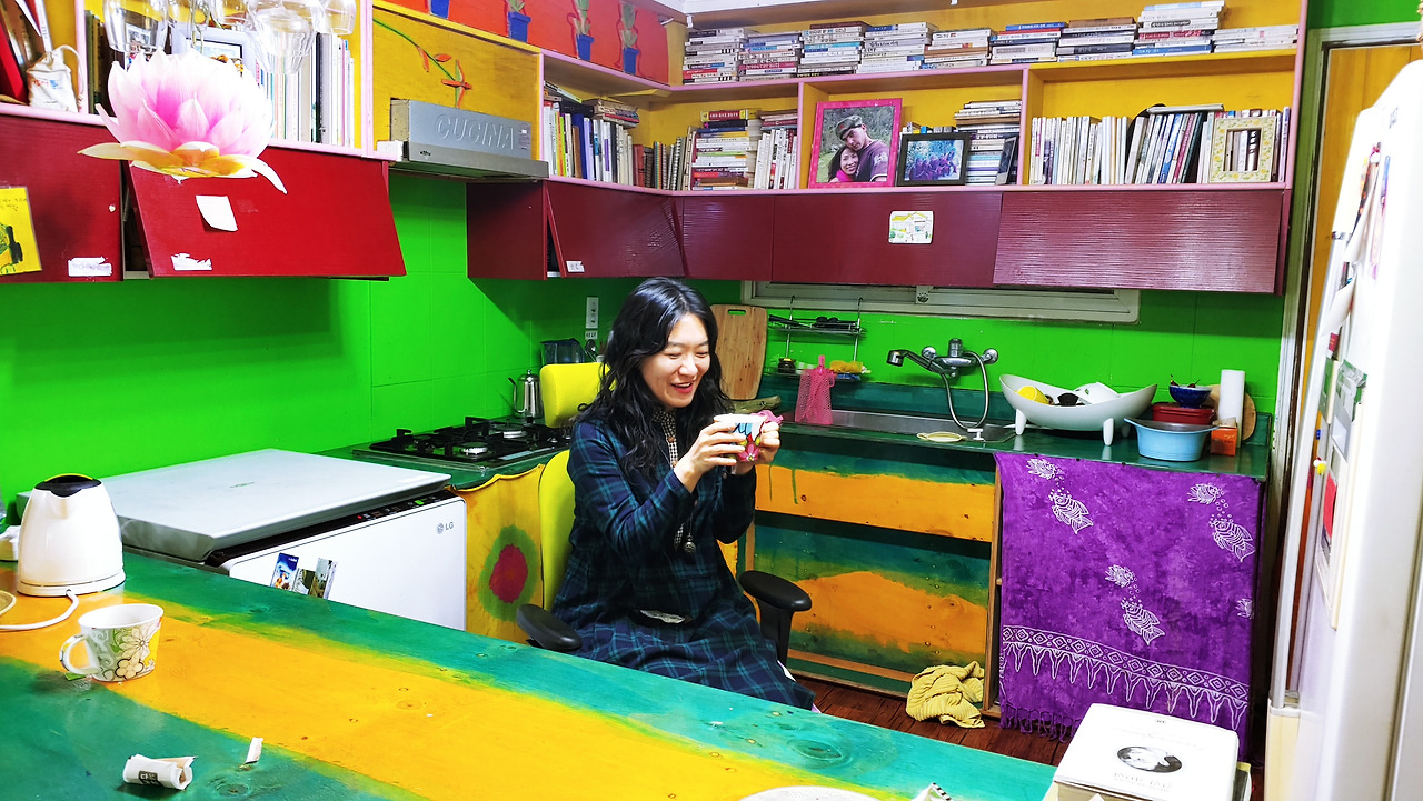 제주도 대평리에서 3일을 보내고 쨍쨍 랜드로 떠나던 날. 지도를 보니 참 먼길. 우선 함덕에서 시골 책방 지기님을 만나고 버스나 택시를 타고 들어가야겠다 생각했는데 못 미더웠는지 시골 책방 지기님이 아예 데려다 줄 작정을 하고 오셨길래 함께 출발했다. 버스를 타고 산으로 산으로 들어가는데 와... 혼자 여행을 계획하면 초지일관 바다만 찾는 나는 이런 곳이 있는 줄도 몰랐겠구나 싶다. 나무와 하늘과 현무암이 계속 이어지는 시골 마을에 도착해서 돌돌돌 거리며 케리어를 끌고 사진으로만 보던 쨍쨍 랜드에 들어섰다. 오렌지빛 현관문 녹색 유리문, 녹색 벽, 붉은 방, 푸른 방, 옷방과 기념품 방 등등... 사진으로 봤을 때는 몰랐는데 막상 오니까 그 현란한 색상 가운데서 묘한 통일감이 느껴져서 안정감이 들었다. 쨍쨍님의 지시대로 집에 밥 먹으러 오는 고양이 밥주고 물주고 이런저런 세팅을 같이 와 주신 분께 인증샷을 부탁했다.