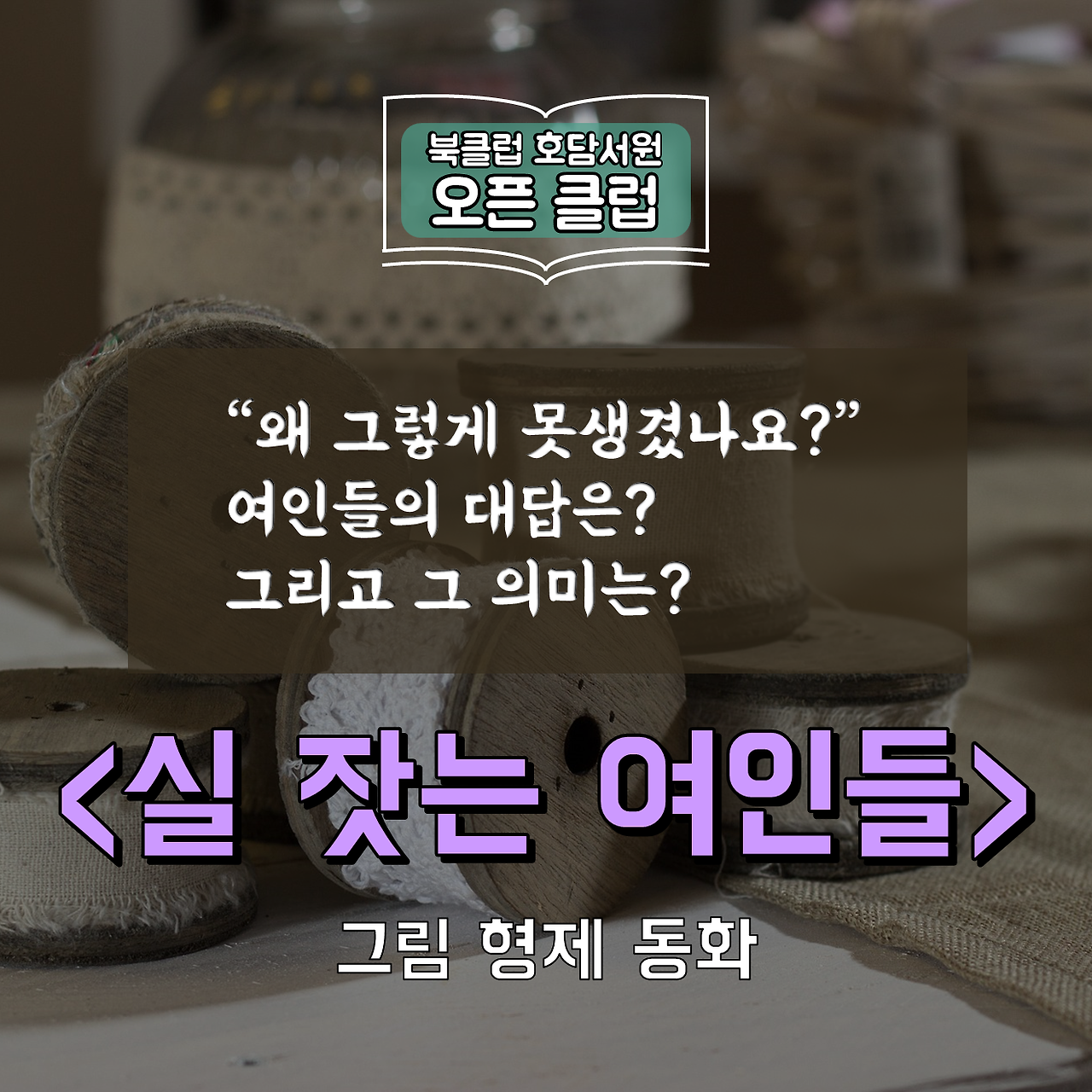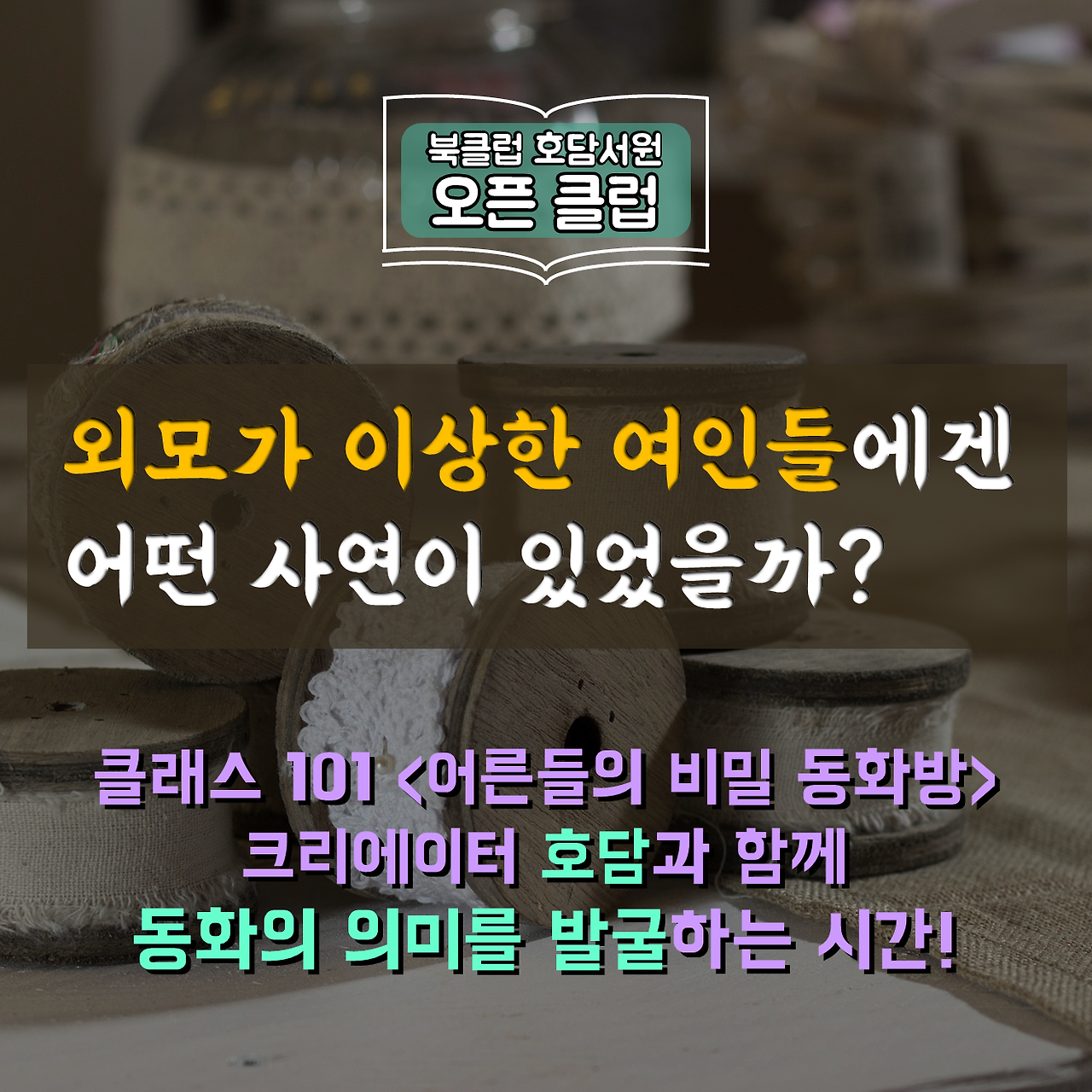 북클럽 호담서원의 오픈 클럽에서 동화를 해석하는 방법과 동화의 엄청난 감동을 느껴보세요. 상상과 전혀 다른 독서와 토론의 경험이 기다리고 있습니다. 이제는 비밀이 된 민담의 상징을 해석하는 방법과 많은 사람들이 선택한 좋은 해결의 방법을 배워보세요. 왜 가장 오래된 것이 가장 현대적인지 진정으로 이해할 수 있을 거예요. 여러분의 노크를 기다리고 있을게요~!