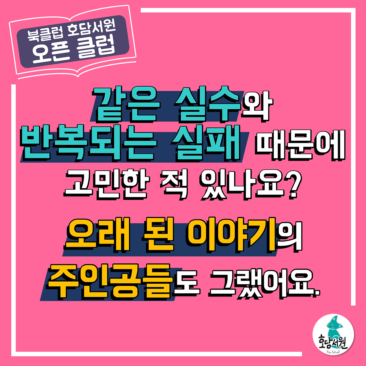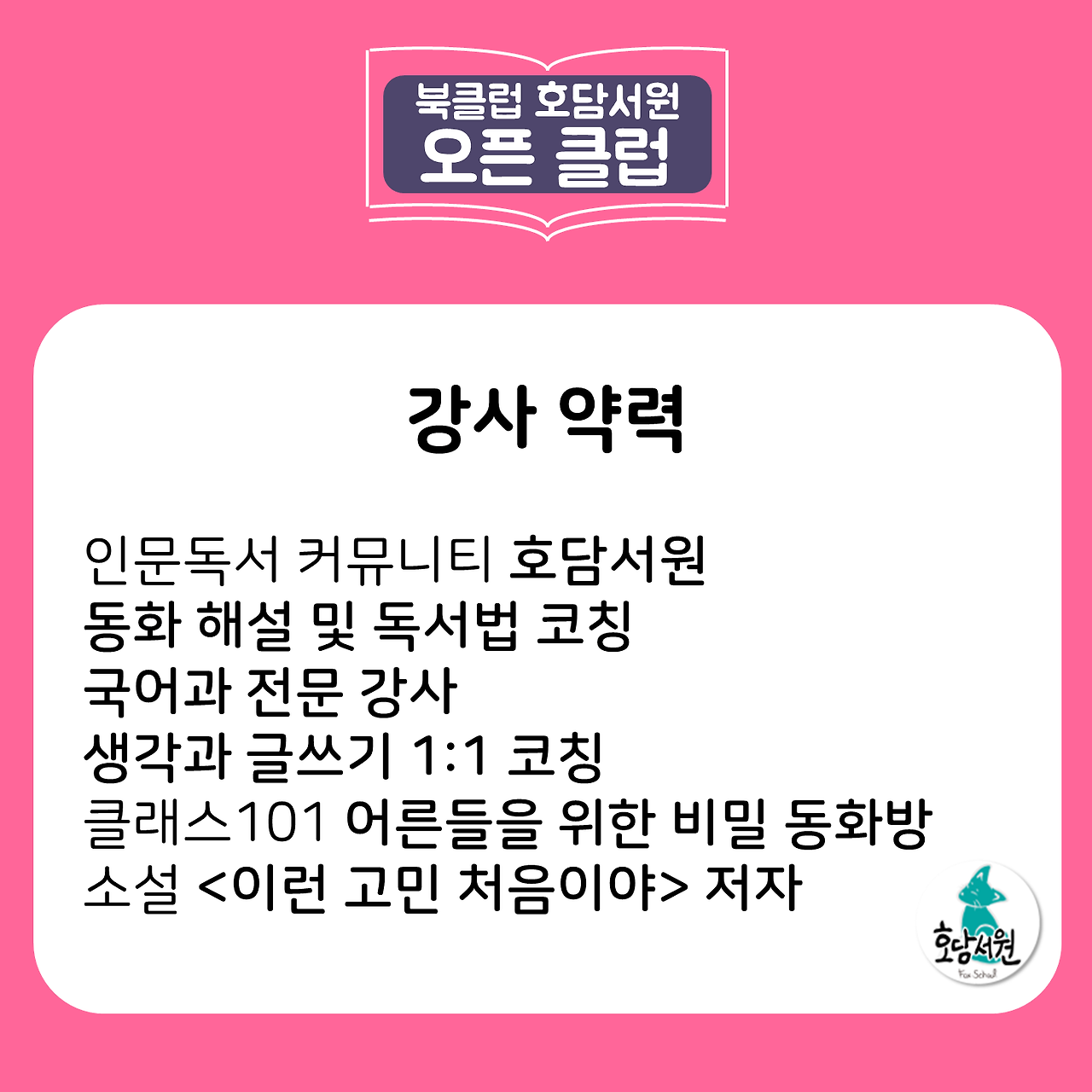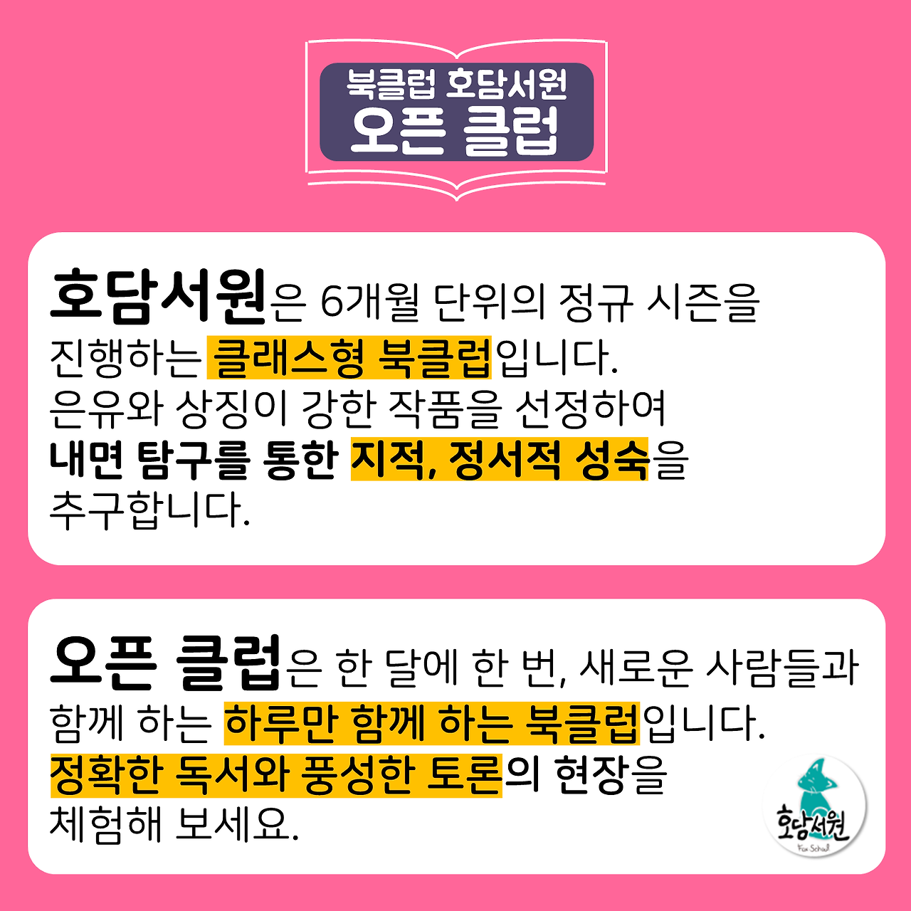 2107 호담서원 오픈클럽 <황금새> : 그림 형제 동화 57번 호담서원은 깊이 있는 독서와 토론으로 자아 탐구를 연습하는 세미나형 북클럽입니다. 다양한 독서 수준을 가진 다양한 연령대의 회원이 있습니다. 북클럽 정규 회원이 되기 전 체험해 보고 싶