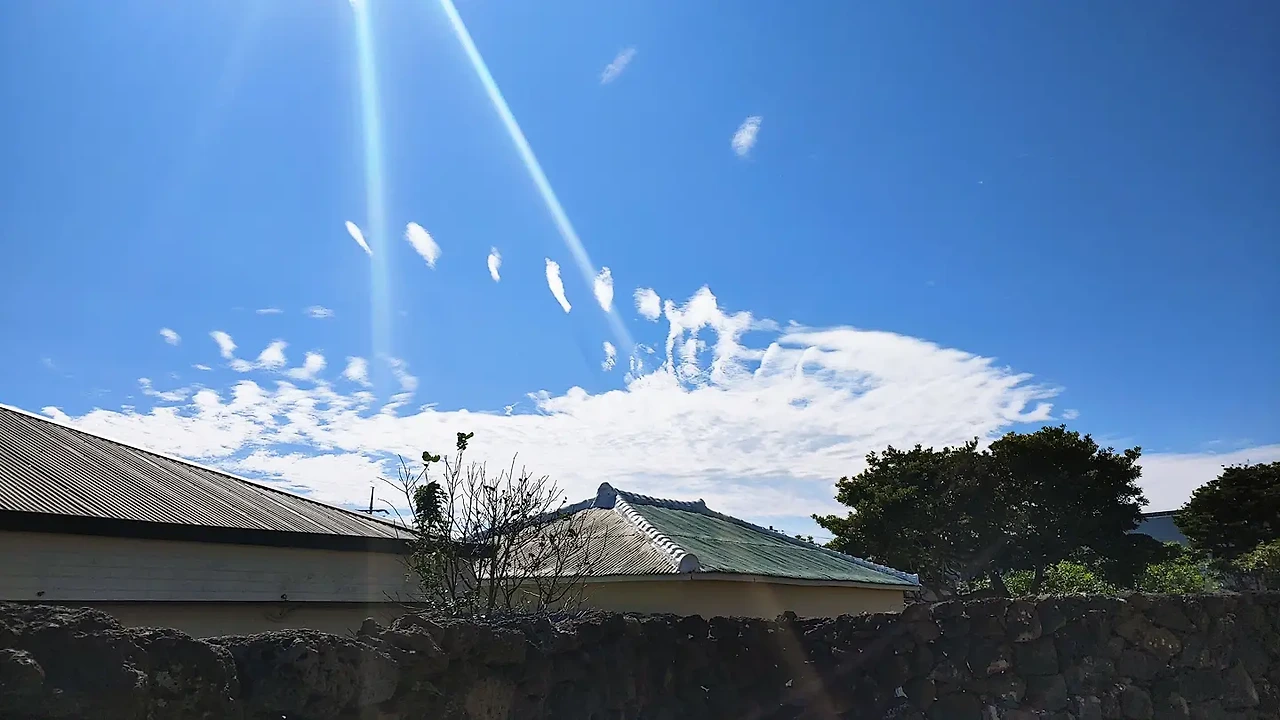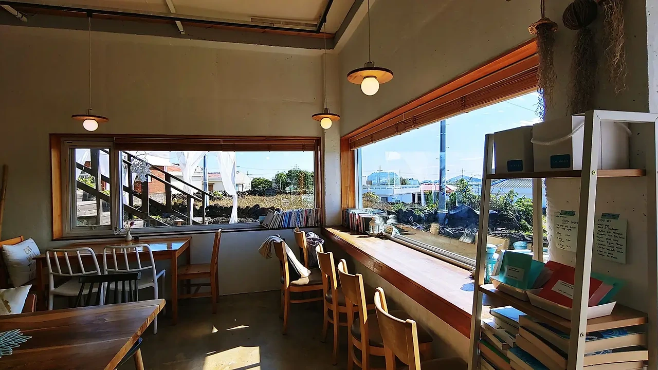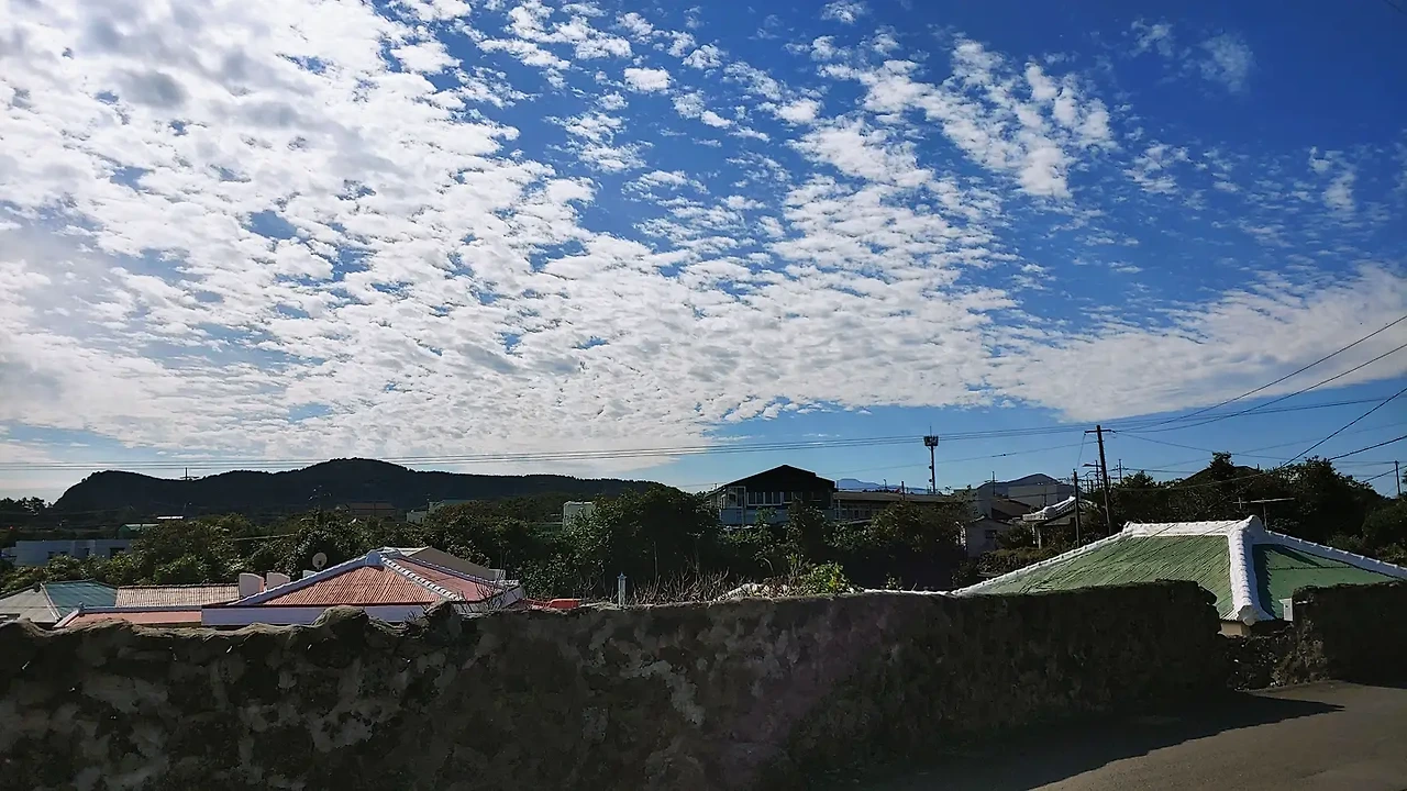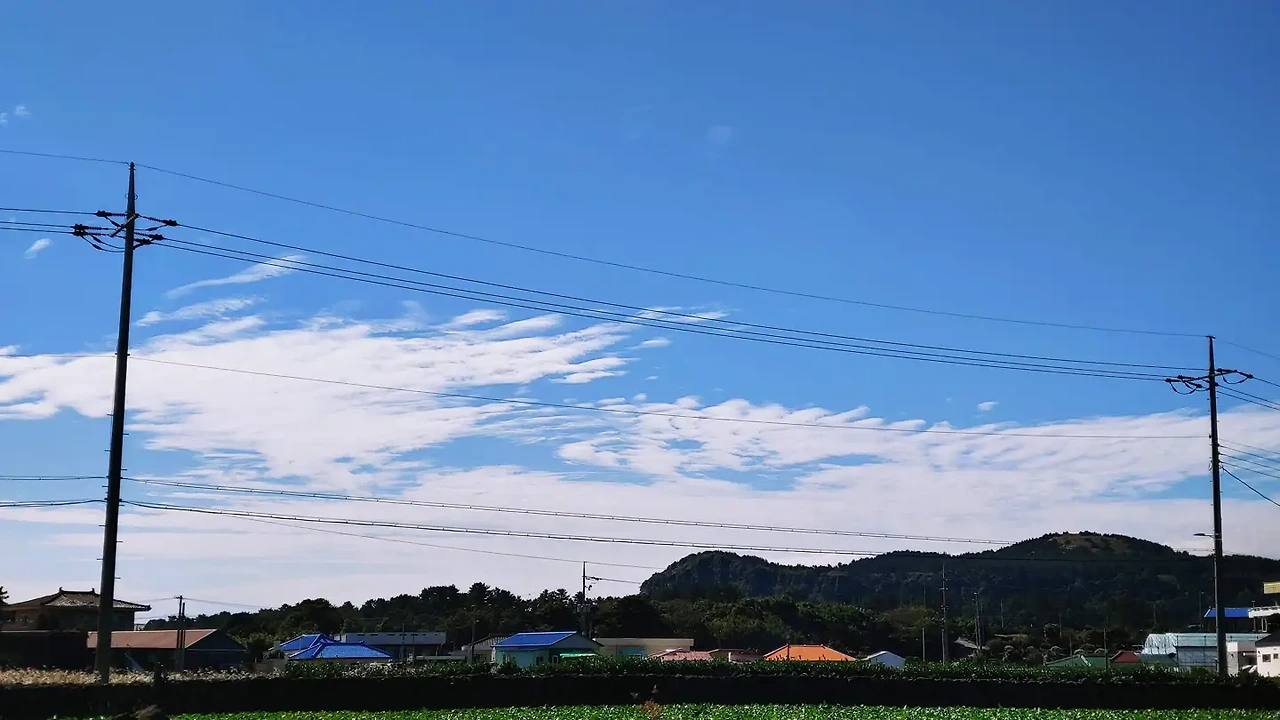 숙소로 돌아와서 짐을 다 내리고 여행 가방 픽업 서비스에 맡길 가방을 현관에 맡기고 사장님께 책을 선물로 드렸다. 고양이 그림이 있는 표지를 보시며 정말 좋아하셨다. 숙소를 나와 작은 동네 종달리를 가로질러 유명한 종달리의 명소들을 하나씩 둘러보고 입구 쪽으로 나오려는데 전에 못 본 카페가 있어서 들어가 봤다. 손님은 나 한 명. 시원한 통유리 너머로 보이는 동네 풍경, 그리고 그날 하루 종일 하늘을 유영하던 고래 구름이 정말 아름다웠다.