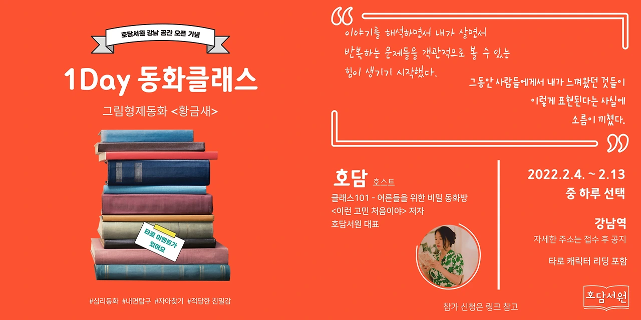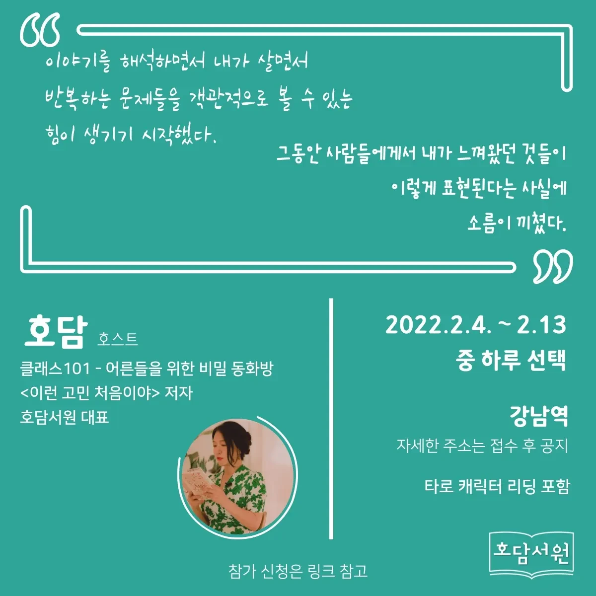 클래스 101에서 '어른들을 위한 비밀 동화방'을 강의 중인 북클럽 호스트 호담이 동화 해석과 함께 인지 처리 방법, 내적 질서에 대한 코칭을 제공합니다. 온라인 수강생 만족도 100%의 동화 해석을 오프라인으로 만나 보세요.