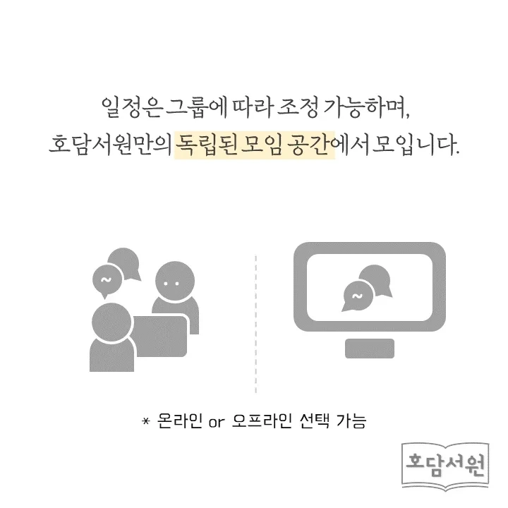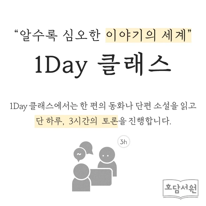 호담서원은 깊이 있는 독서와 토론으로 자아를 탐구하는 북클럽입니다. 다양한 독서 수준을 가진 넓은 스펙트럼의 회원들을 위한 글쓰기와 독서, 생각 코칭 프로그램이 있습니다. 북클럽 정규 회원이 되기 전에 1 Day 동화 클래스에 참여해 보세요. 호담서원 스타일의 심도 깊은 토론의 매력에 푹 빠지실 거예요.