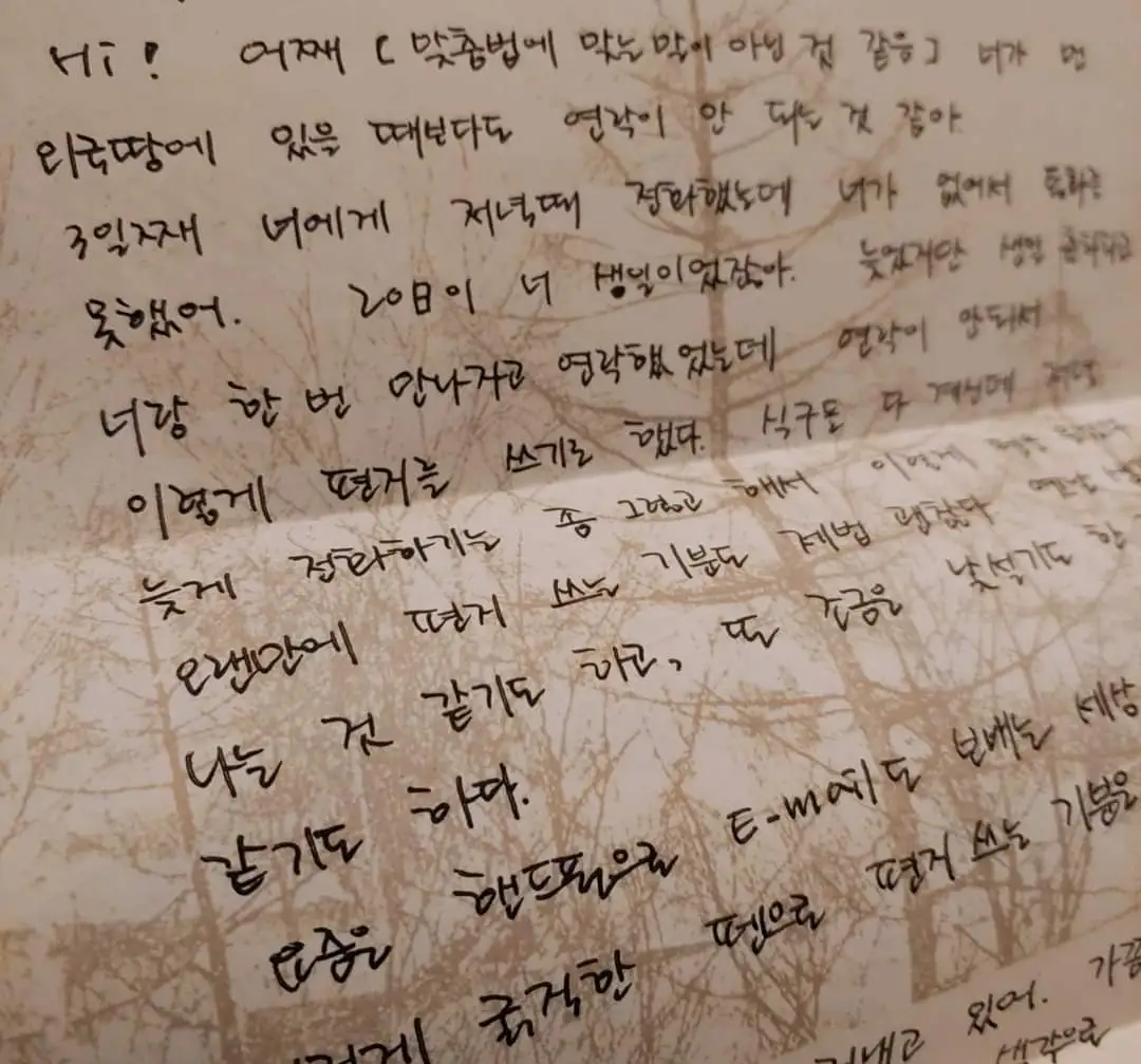 대학 졸업하고 우즈베크에 가 있는 동안 나에게 계속 편지를 보내준, 교회 사람이 아닌 친구. 임용 준비하느라 돈이 없을 때 밥도 화장품도 사주고 부담 없이 미안해하지 않으며 만나도 됐던 친구. 내 생일에 전화를 세 번이나 했는 내가 없어서 통화를 못했고 내가 이메일을 잘 안 해서 썼다는 편지. 같이 어릴 적 살던 동네에 같이 가보자고 보고 싶다고 힘내서 잘 살자고 요즘 살이 쪘고(하나도 안 쪘는데) 회사에서 스트레스가 많다고 쓰여 있다. 아픈 내 동생 안부와 부모님 안부를 묻는, 내 가족과 연애를 다 아는 친구. 두 장의 편지에서 20대 중반인데도 성숙하고 배려심 많은 친구의 깊이가 읽힌다. 난 그 시절 이걸 알았었나?