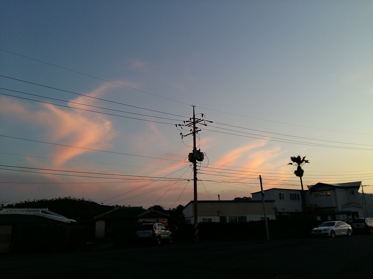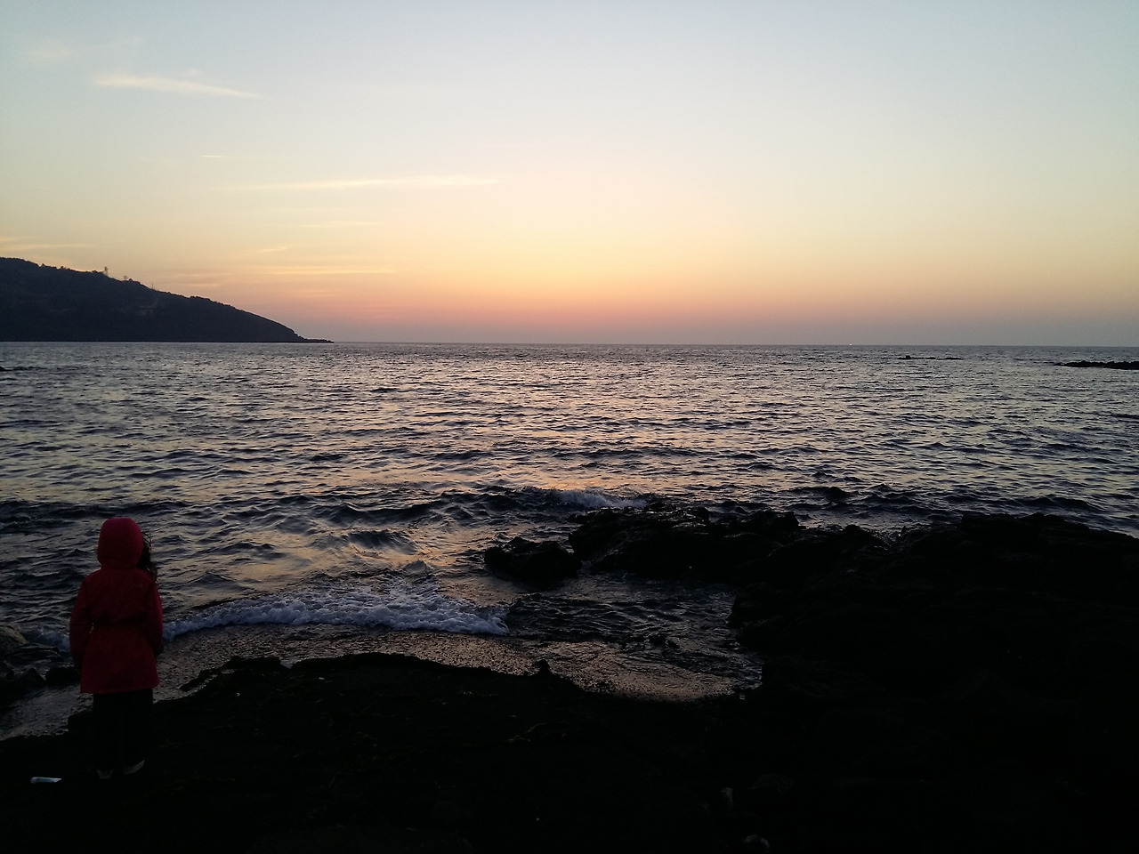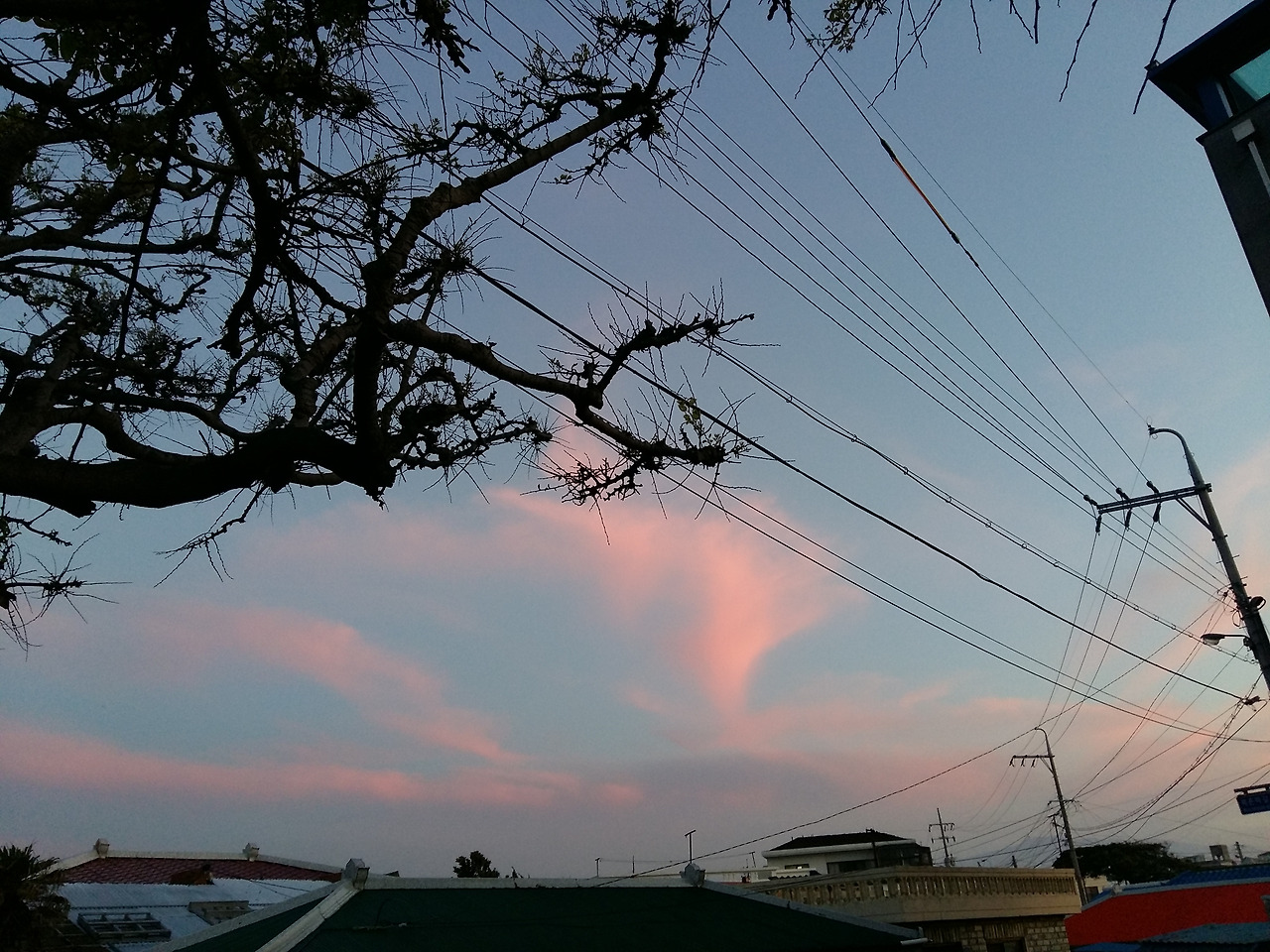 나와 이모 조카 커플은 마을 어귀의 현무암이 있는 작은 바다 끝에서 노을을 봤다. 하늘이 참 아름다웠다... 해가 지고 나니 하늘이 점점 핑크빛이 되어간다.