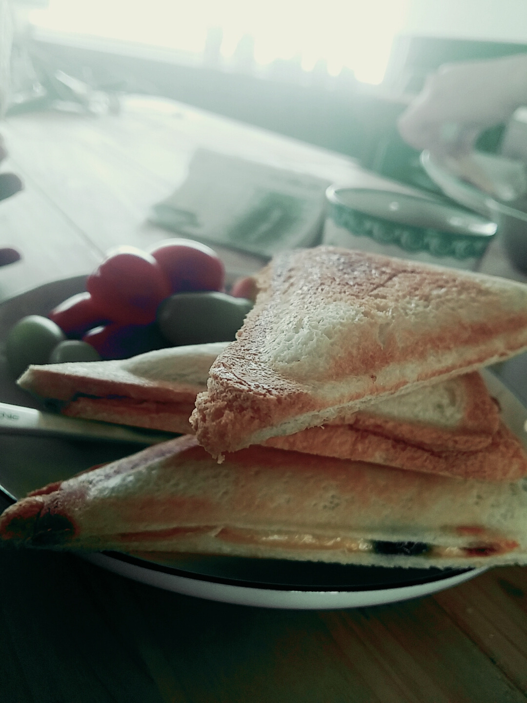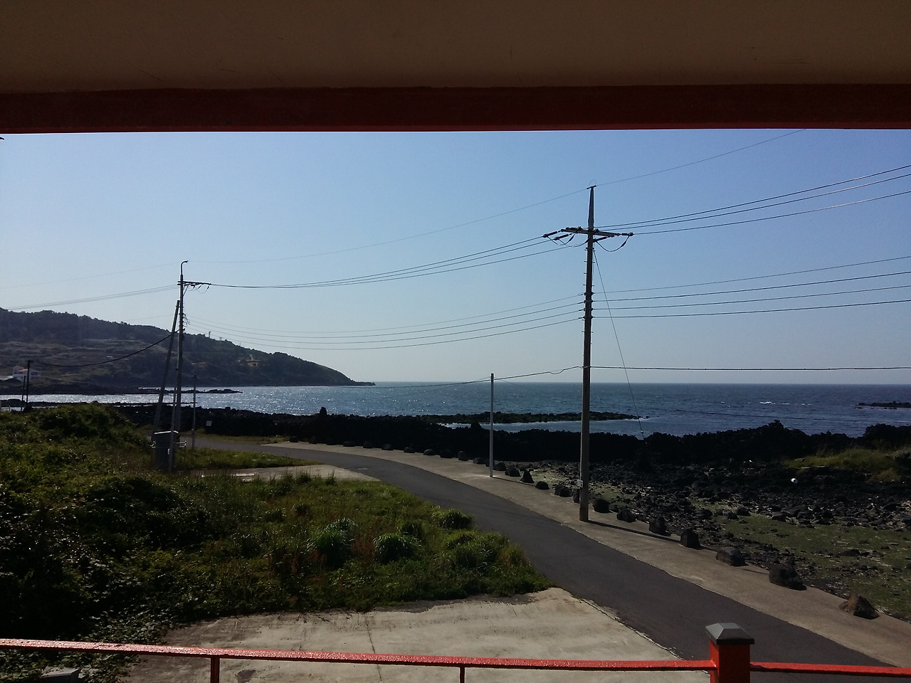 엽님은 예비군 훈련 가고 비수기라 게스트가 없어서 조식 먹는 사람은 나 혼자였는데 고기 안 먹는 나를 위해 사장님이 새로운 메뉴를 만들어 주셨다. 시나몬을 넣고 졸인 사과를 넣은 샌드위치, 바나나와 치즈에 건포도를 넣어 구운 샌드위치를 쌓아 놓고 오늘 로스팅한 원두로 내린 핸드 드립 커피, 우유, 자몽주스와 몇 가지 과일을 너무 심했다 할 정도로 많이 먹었다. 식사를 마치고 테라스를 나가보니 숙소 앞바다가 유난히 반짝인다. 오늘 자외선 지수가 최근 들어 최고란다. 아무래도 올레길 걷기는 무리다.