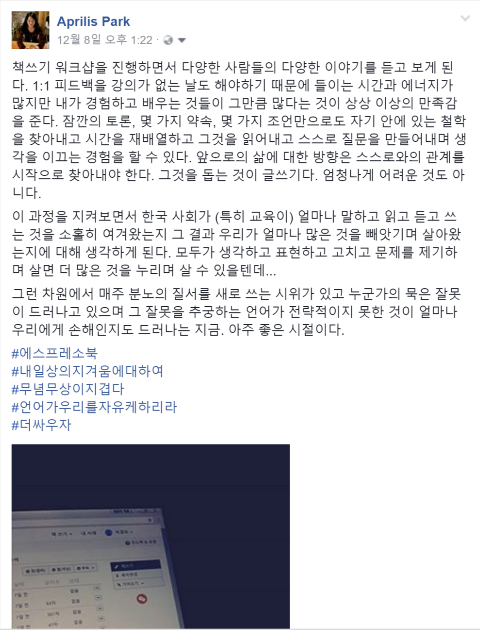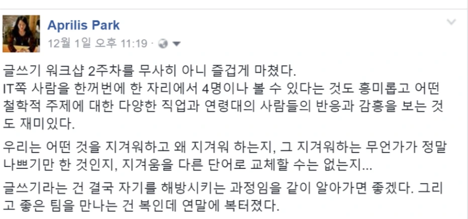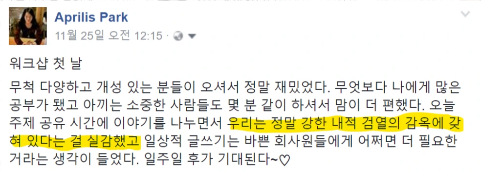 첫 수업 후 내 페이스북 포스팅 - 수강자들의 내적 억압은 나에겐 약간 충격이었다.