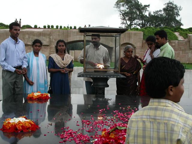 1948년 1월 30일 테러로 죽은 마하트마 간디가 화장된 곳인 라지 가트(Raj Ghat)에 서면 저절로 엄숙해졌다. 유해나 유골을 안장한 묘는 아니었지만 간디 선생을 추모하기 위해 만들어 놓은 장소로, 참배 행렬이 끊이지 않고 모여들었다. 앞에 여러 팀이 기다리고 있어서 우리 차례가 올 때까지 차분히 기다렸다.