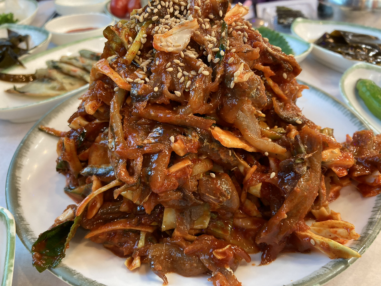 (멸치회를 처음 먹었을 때 살짝 얼어 있는 느낌과 비릿한 향이 올라와 조금 어색했다. 그런데 오늘은 철을 맞아 멸치회가 살아있고 싱싱했으며, 미역과 함께 입안에 넣었을 때 기장 앞바다의 생생한 파도의 물결이 입안에 가득했다.)