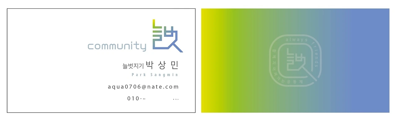 COMMUNITY 늘벗. 늘벗지기 박상민. 그리고 이 명함은 누구보다 나의 사랑하는 늘벗가족들과 함께 가장 먼저 나눴다. 그리고 앞으로 계속될 만남속에 누군가에게 명함을 나눠줄 일들이 기대가 된다. 명함을 받고 그 플랫폼이 그리웠다. 그래서 나는 연락했다. 어떻게 불러야 할지 몰라 여쭤봤다. “형님”과 “아우”가 어떠냐고 물으셨다. 나는 너무 좋았다. 부산에 형님이 필요했다. 부산 친구들이 “행님”하는 그 소리가 담긴 정겨움에 샘났던 내 마음이 넉넉해 졌다. 왜냐고? 앞으로 계속될 만남이 기대되는 “행님”이 나에게 생겼으니까!