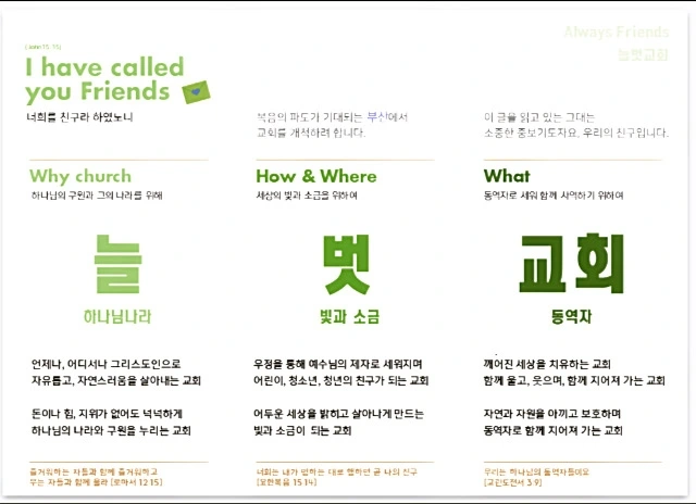 한글 자체만으로도 가지고 있는 힘이 있길 바라며, 10년 뒤에도 20년 뒤에도, 능히 오래가는 그런 로고. 그것을 위해 나는 기도했다. 그리고 늘벗교회의 이야기를 페이스 북에 남기기 시작하며, 그 기도는 조금더 절실해졌다. 그런 상황속에 페이스북 메신저로 연락이 왔다. 신기한 것은 그분도 기도를 하던 상황속에 계속되는 마음의 잇닿음을 느꼈던 것 같다. 그분은 훗날 동역자가 되고, 형님이 되며, 우리 늘벗교회의 로고를 창조하신 분이 된다. 그분은 산새봄샘꿈 대표 이진웅 형님이시다.