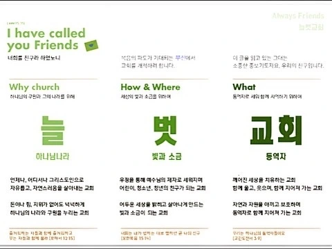 어른이 먼저 고개를 숙이고 무릎을 꿇어 아이들에게 눈높이를 맞춰 친구가 되려 용기 내는 교회. 산, 바다, 강, 그리고 함께 살아가는 동물들을 돌보며 가꾸어 갈줄 아는 녹색 교회