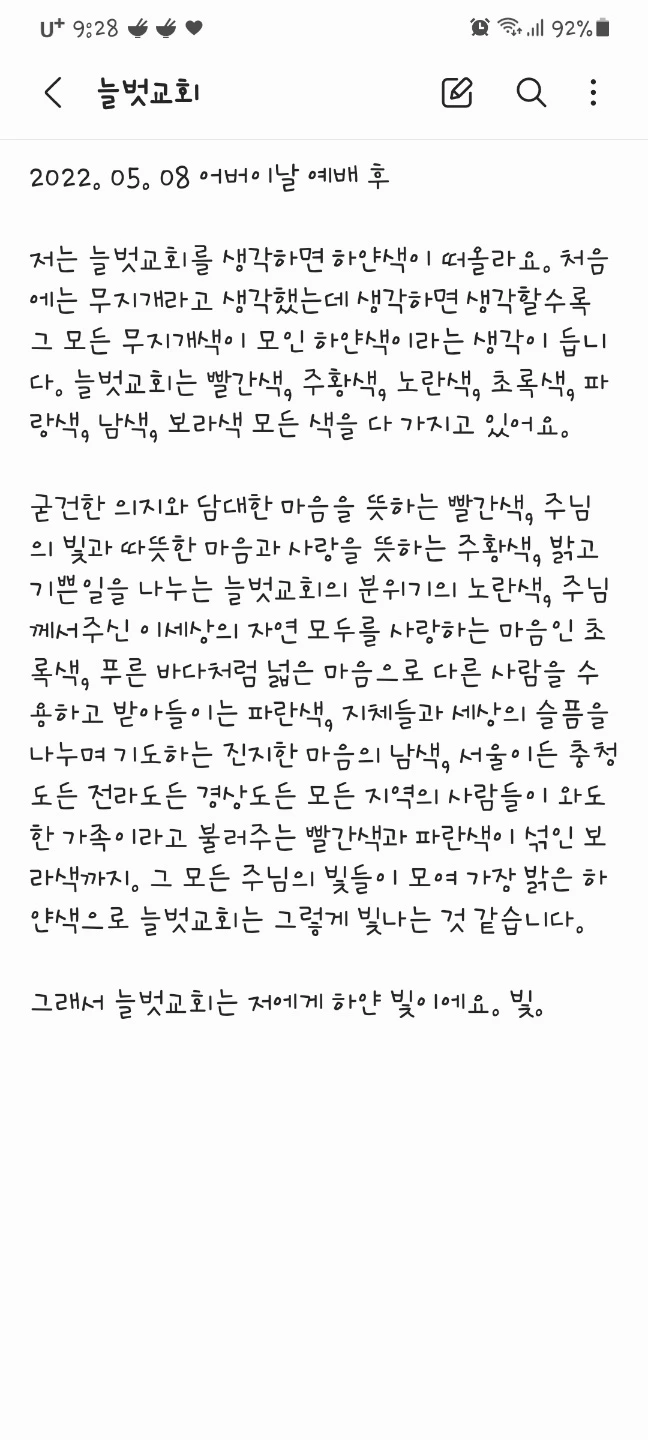 그래서 늘벗교회는 저에게 하얀 빛이에요. 빛.