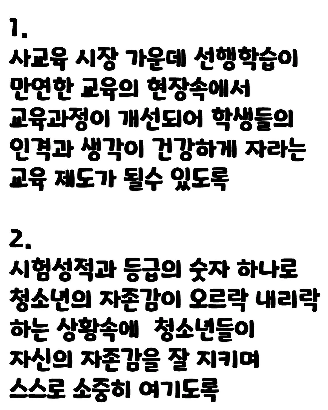 1. 사교육 시장 가운데 선행학습이 만연한 교육의 현장속에서 교육과정이 개선되어 학생들의 인격과 생각이 건강하게 자라는 교육제도가 될 수 있도록